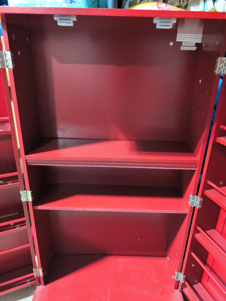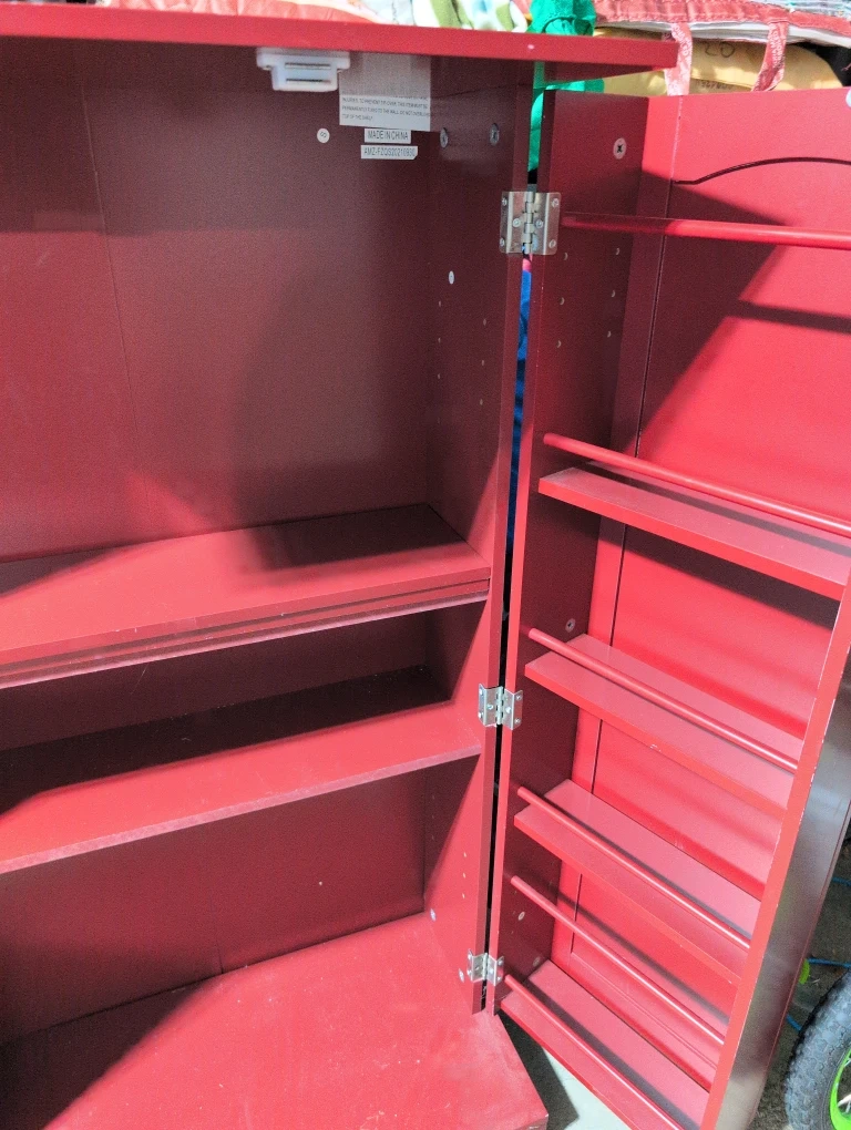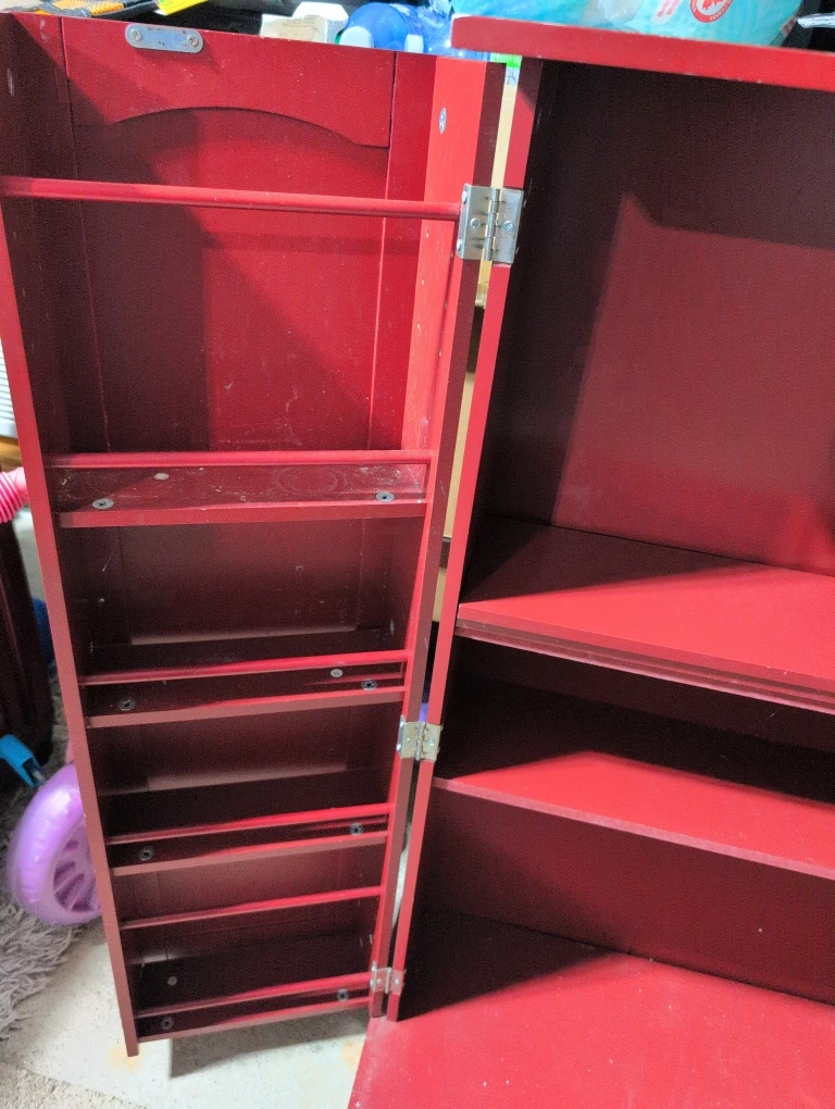 Selling a red wooden storage wine cabinet. It features shelves and compartments for organization. Great for kids' rooms or play areas to store toys and books!