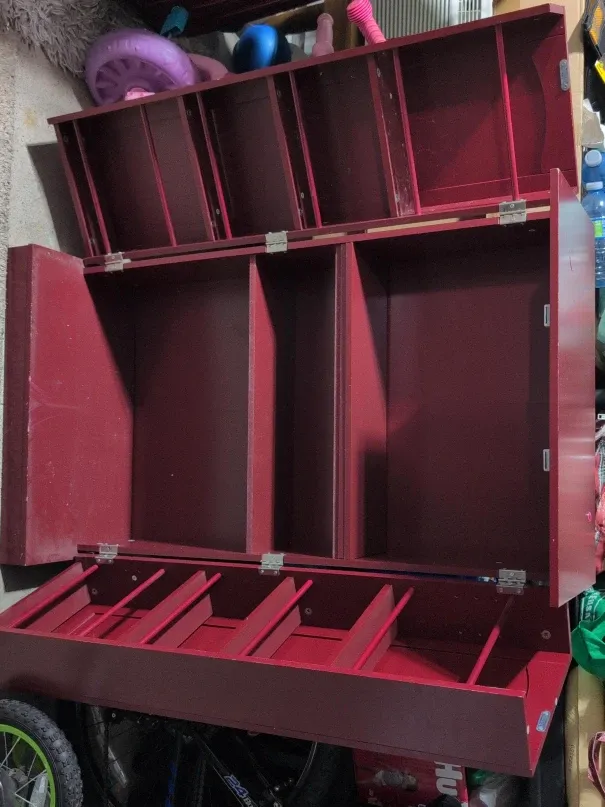 Selling a red wooden storage wine cabinet. It features shelves and compartments for organization. Great for kids' rooms or play areas to store toys and books!