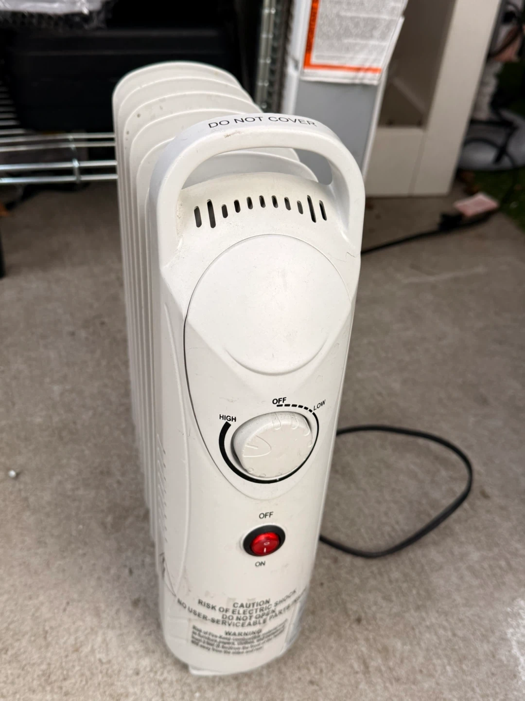 Selling a white oil-filled radiator heater. It has settings for off, low, and high. Please note the heater has some signs of use.