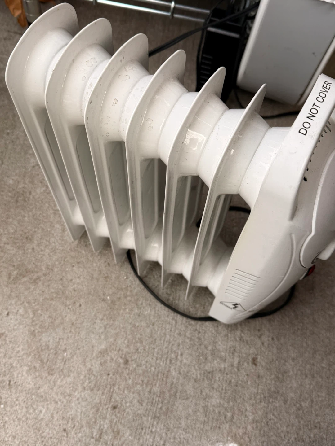 Selling a white oil-filled radiator heater. It has settings for off, low, and high. Please note the heater has some signs of use.