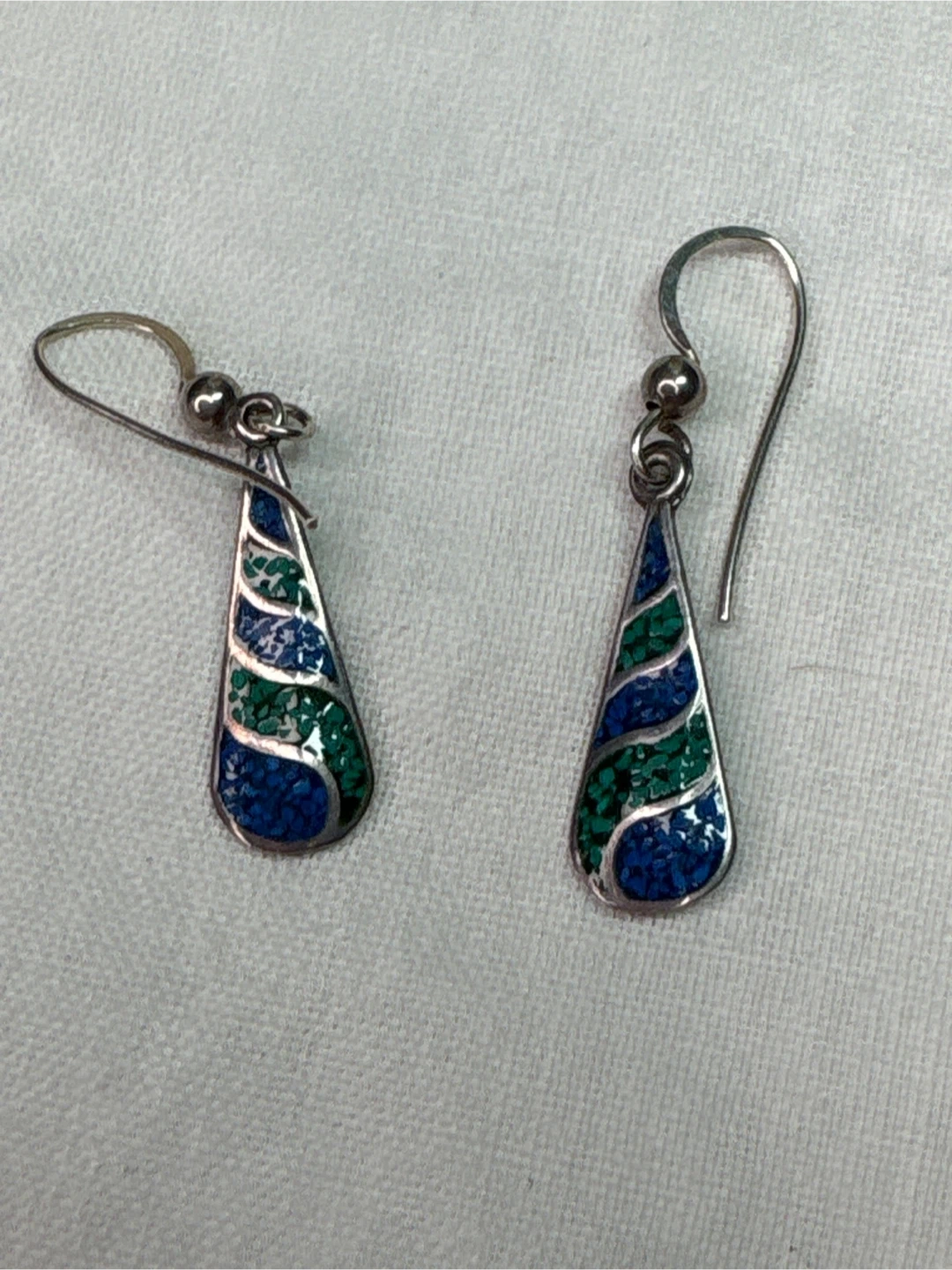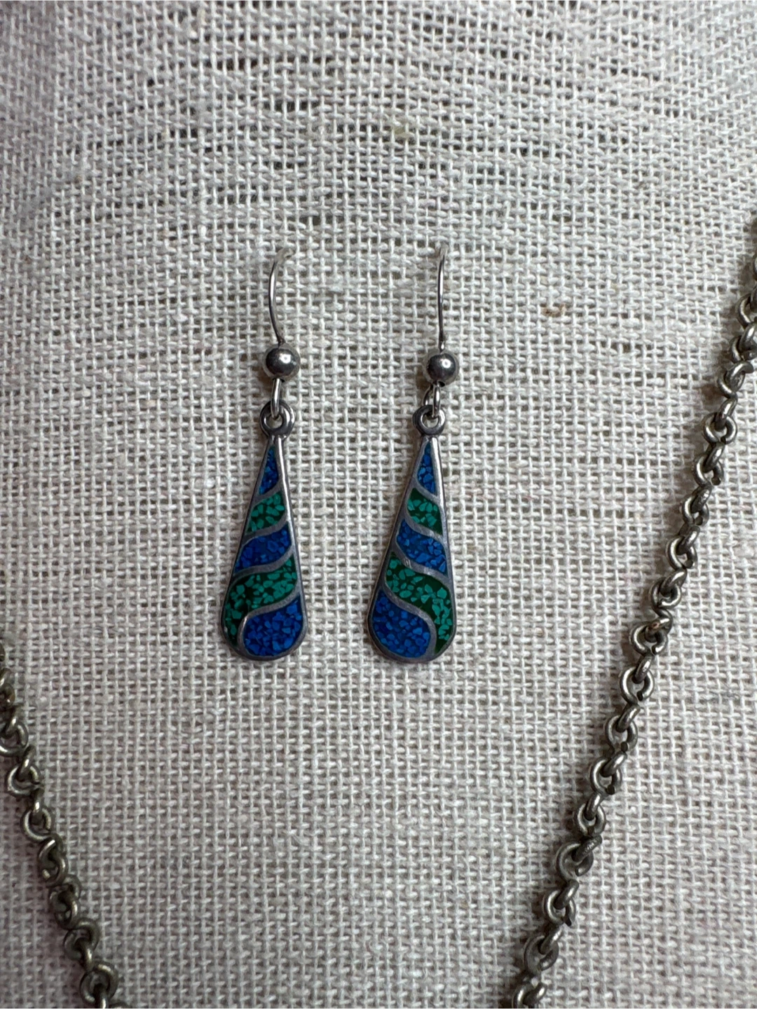 Beautiful sterling silver earrings from Mexico , that have lapis and malachite inlay. A sterling silver ring , size 6.5 with turquoise enamelling and silver tone necklace set with turquoise chip inlay. A Southwestern design. The earrings feature a teardrop shape with inlaid blue and green stones. The necklace has a triangular pendant with turquoise inlay mosaic of stones.