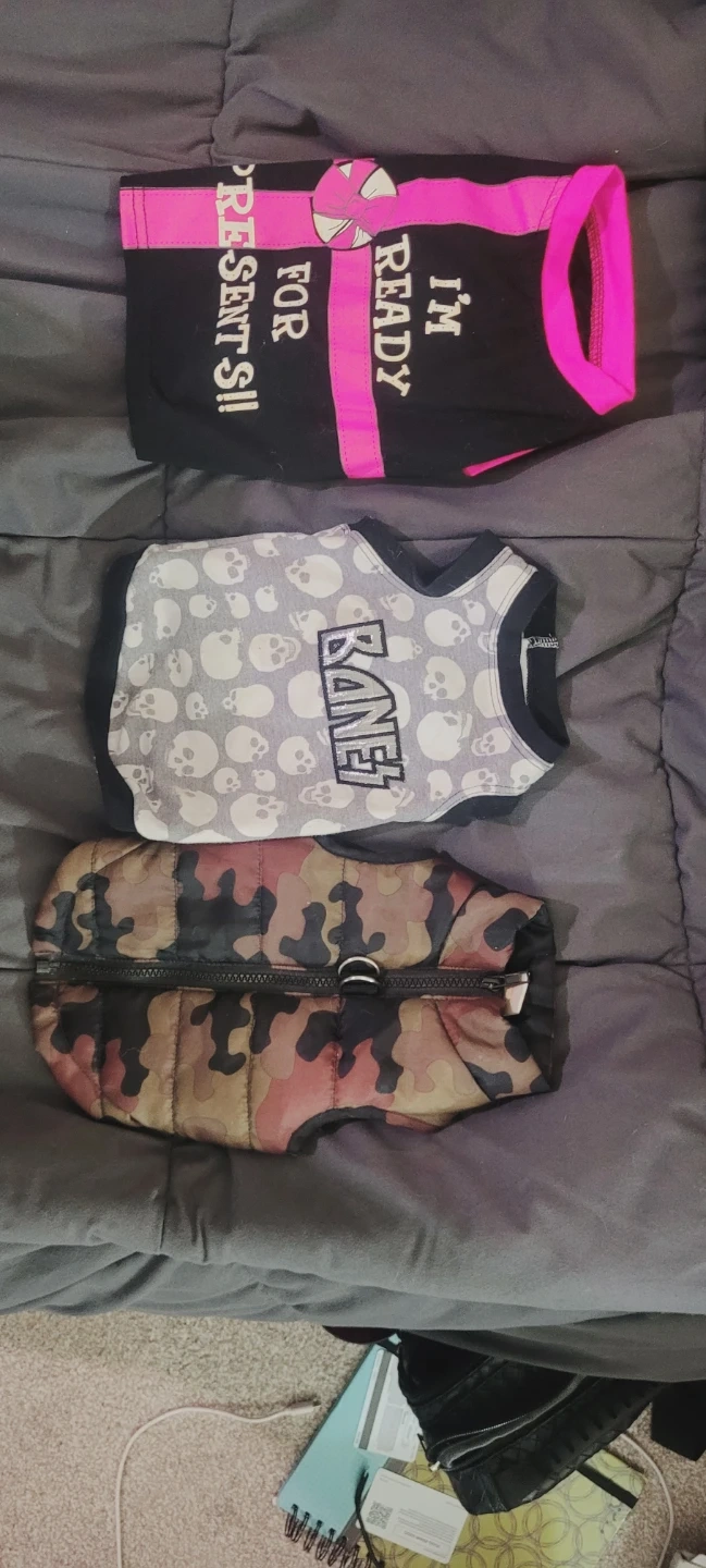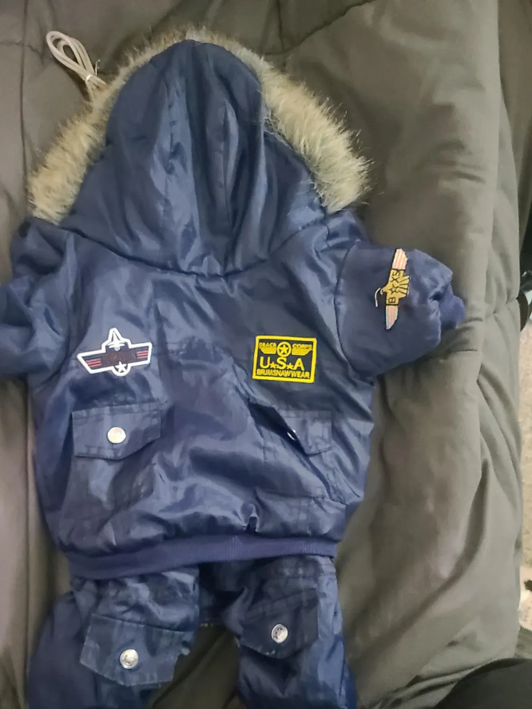 This blue dog winter jacket has a faux fur lined hood and snap closures. It features embroidered patches and utility pockets. It's designed for keeping your pet warm in colder weather. Also included the dog shirts and vests