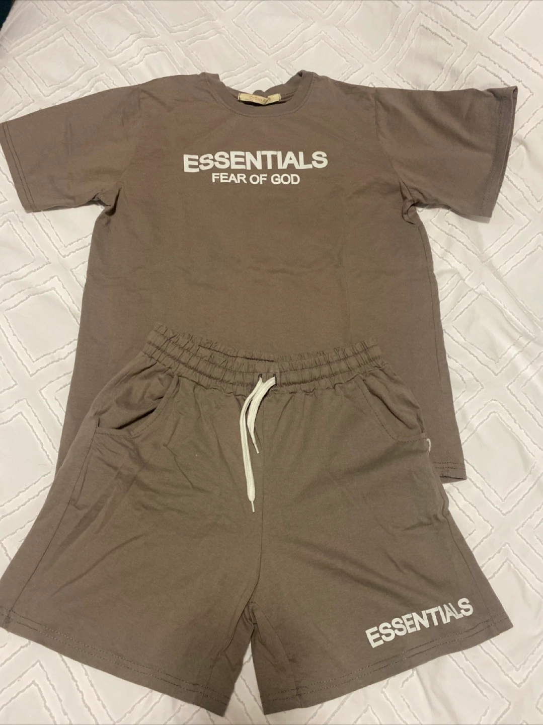 Brown t-shirt and shorts set. Features Essentials Fear of God branding. Relaxed fit, comfortable material. Great for casual wear. Excellent condition unisex