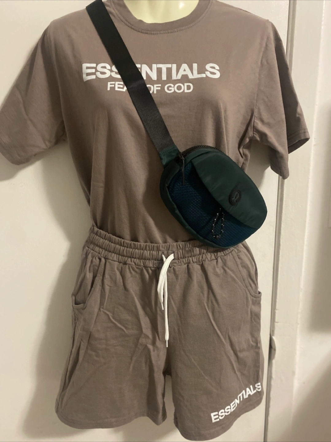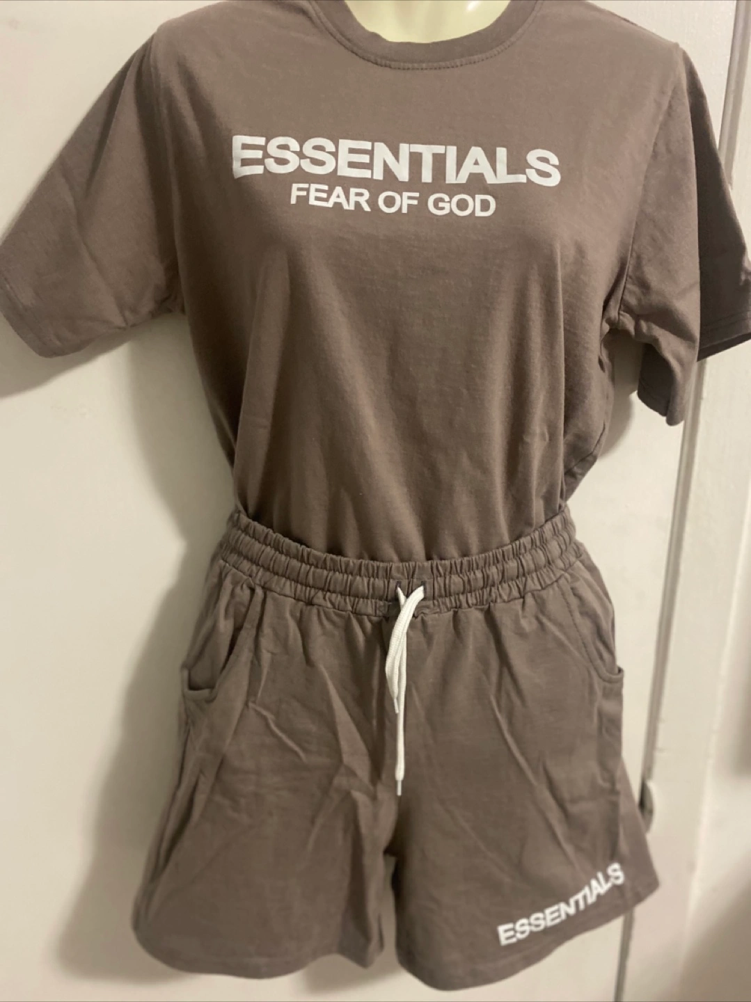 Brown t-shirt and shorts set. Features Essentials Fear of God branding. Relaxed fit, comfortable material. Great for casual wear. Excellent condition unisex