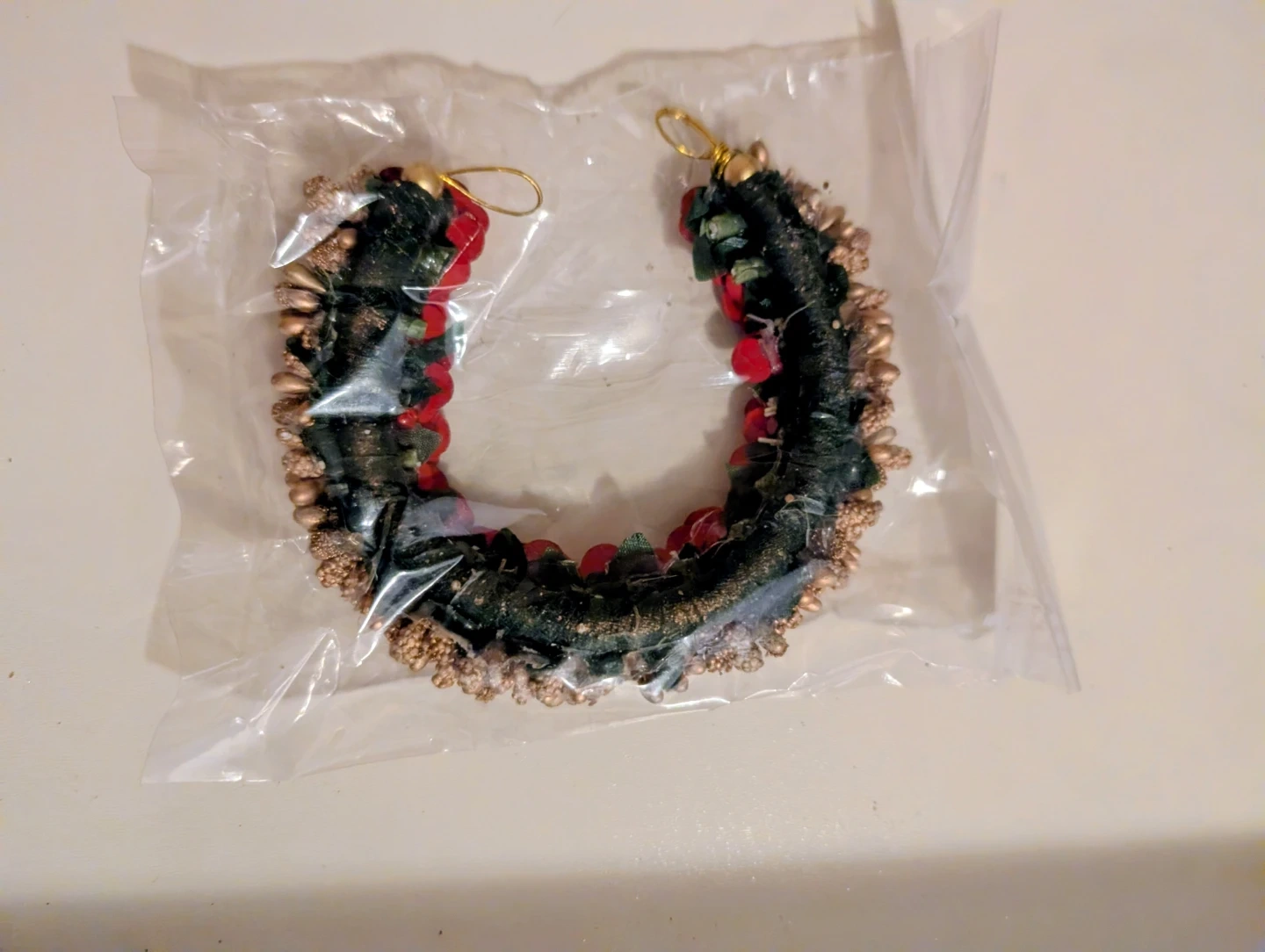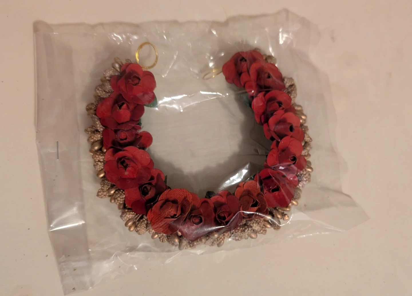 A decorative hair accessory featuring red fabric flowers and gold-toned beads. It's designed to be worn around a bun or as part of an updo. This piece adds a touch of colour and embellishment to hairstyles.