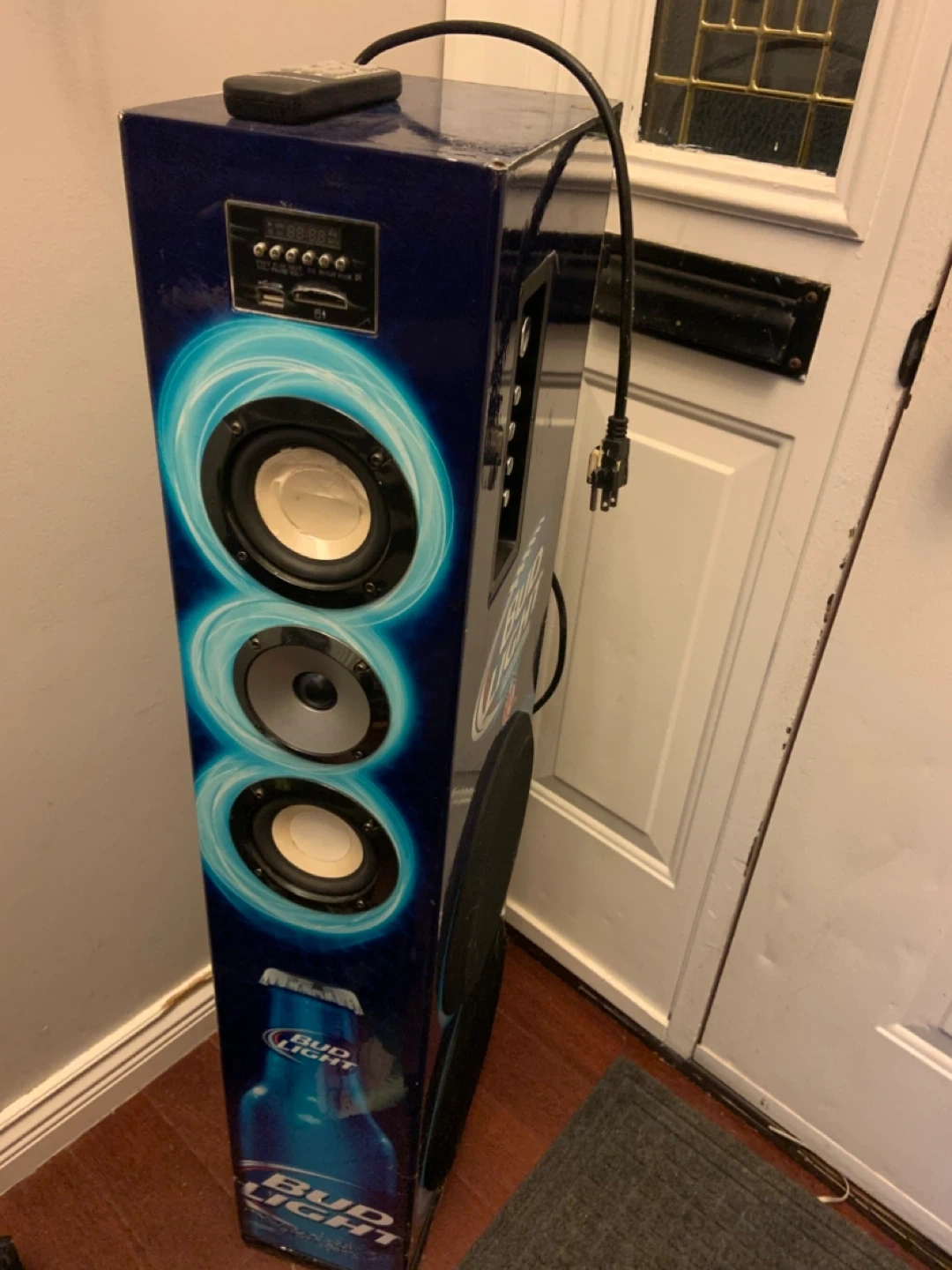 This Bud Light speaker tower features multiple speakers and adjustable volume, bass, and treble control. A remote control is included for easy operation.