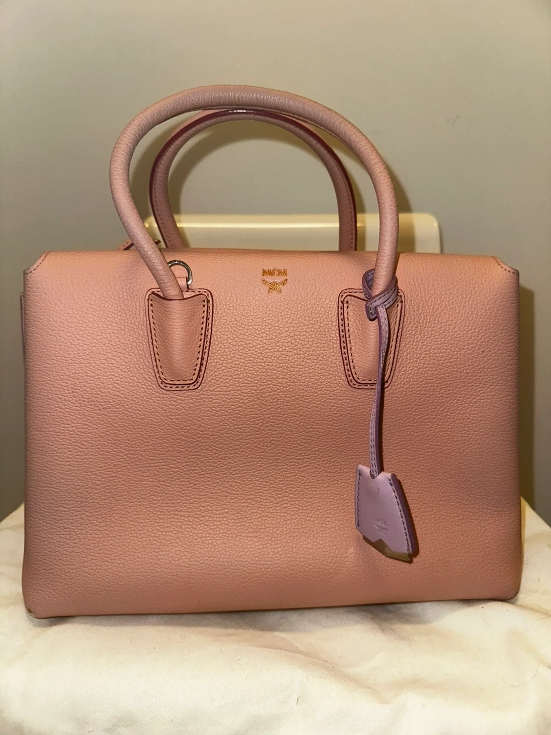 This MCM top handle bag is crafted from pink pebbled leather. It features a spacious interior with pockets and a zip closure. Includes the original MCM dust bag.