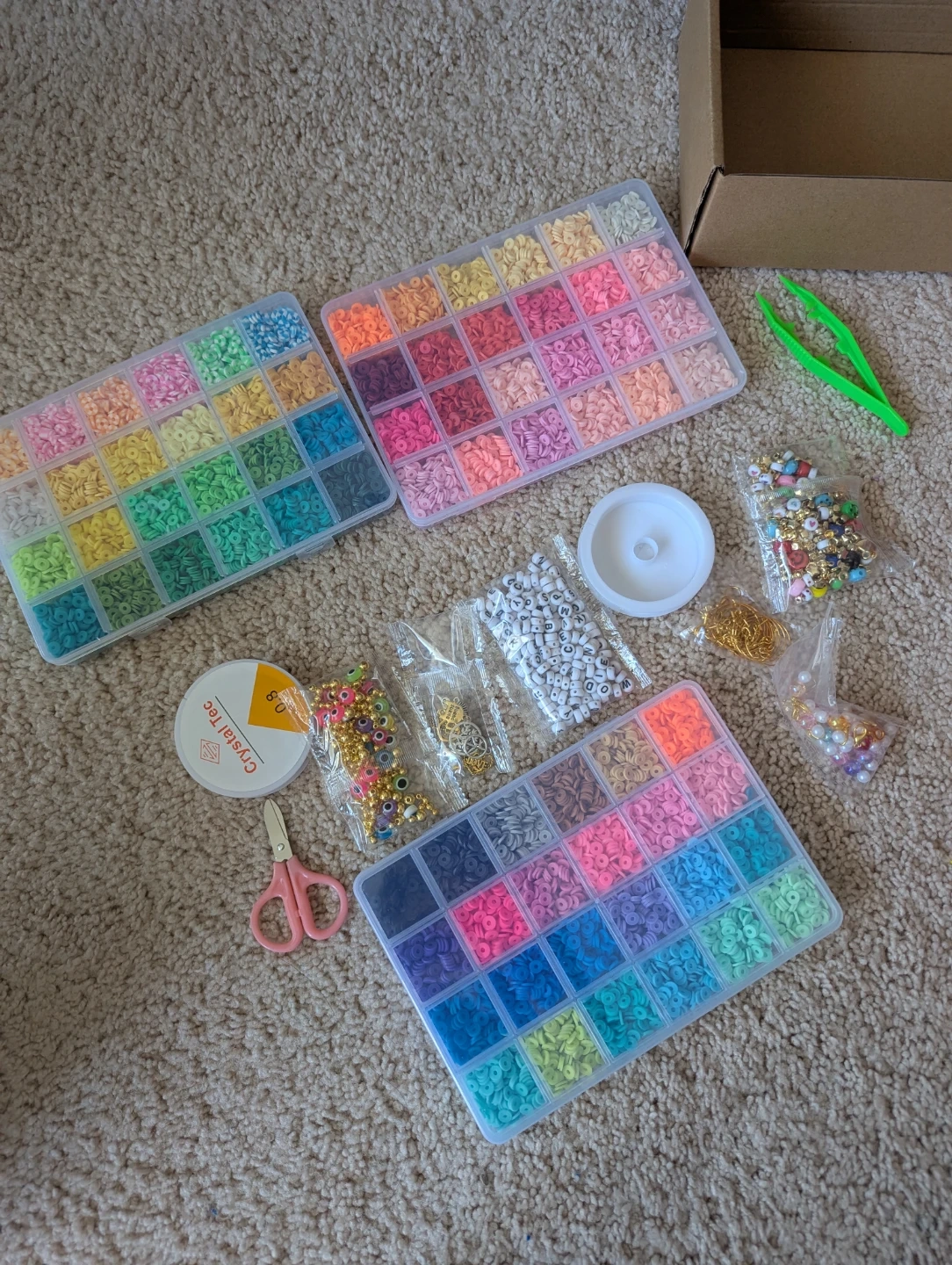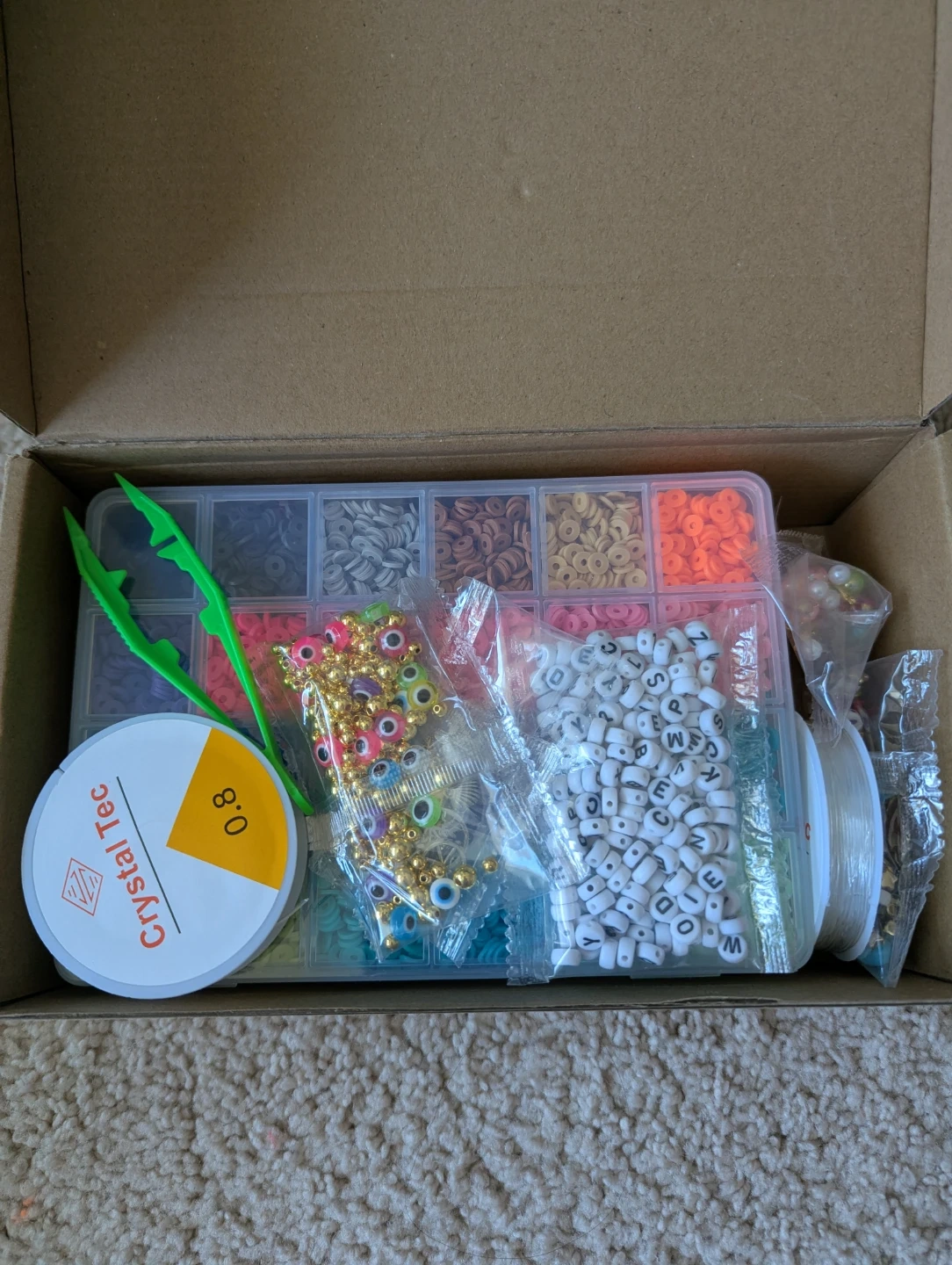 Complete set for making bracelets and necklaces. Includes a variety of colourful beads, letter beads, and findings. Also comes with elastic string, scissors, and tweezers. Comes in a box.