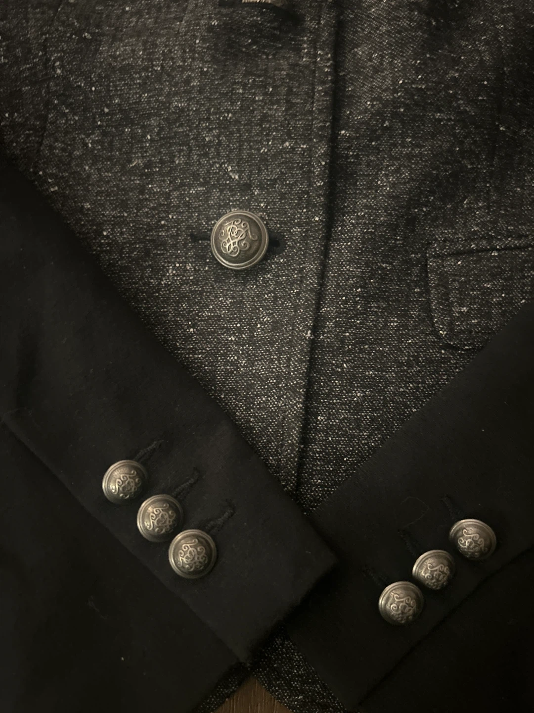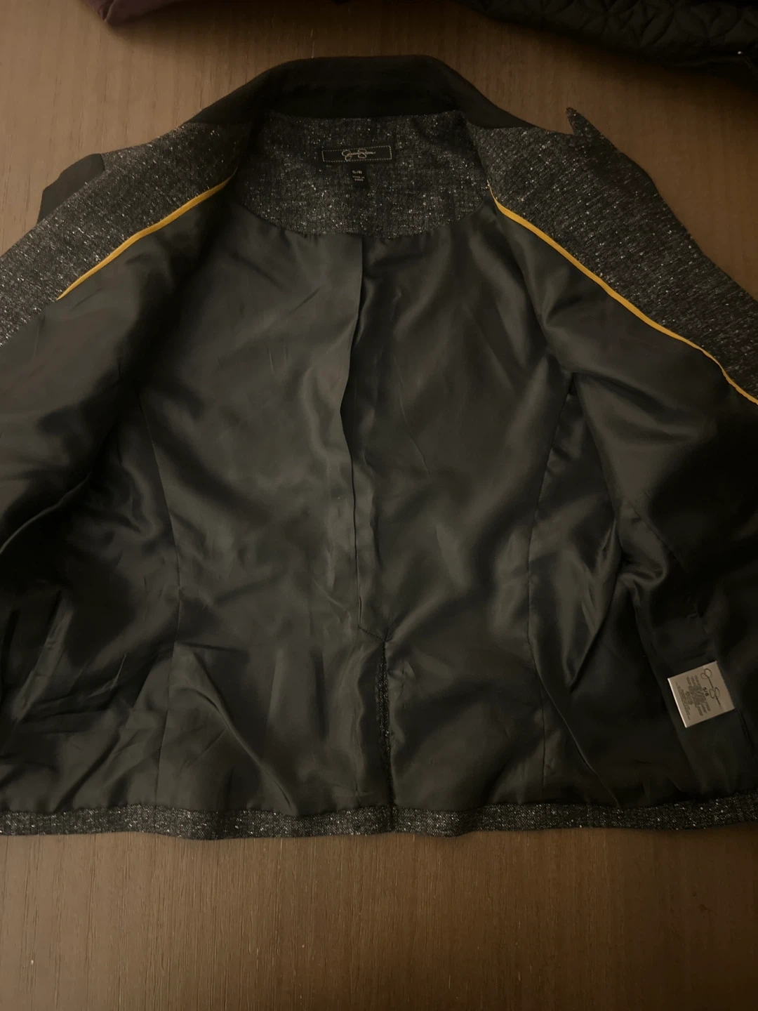 This Jessica Simpson blazer features a tweed-like front with black sleeves. It has decorative buttons on the cuffs and front closure. Size is 5/6.