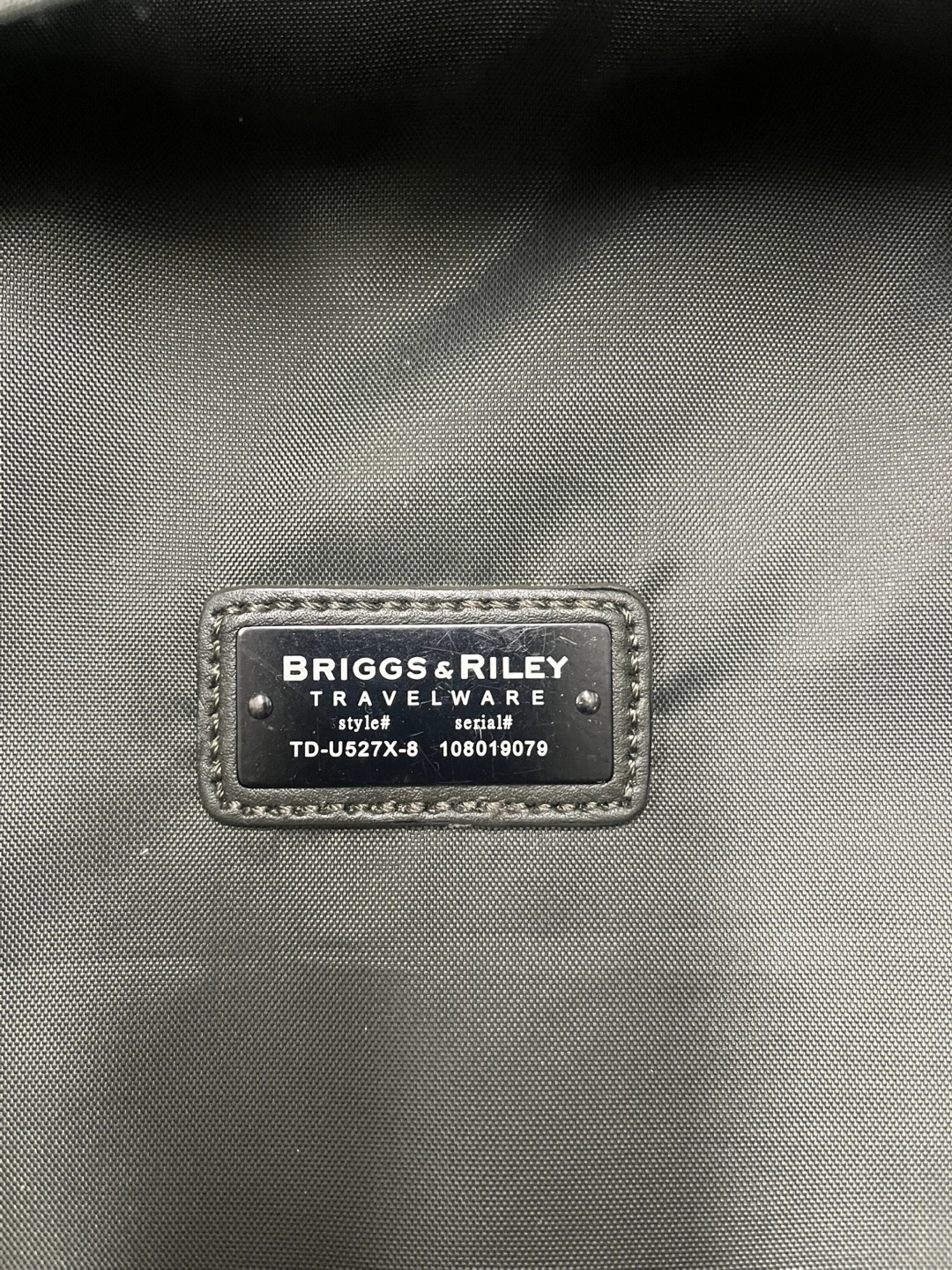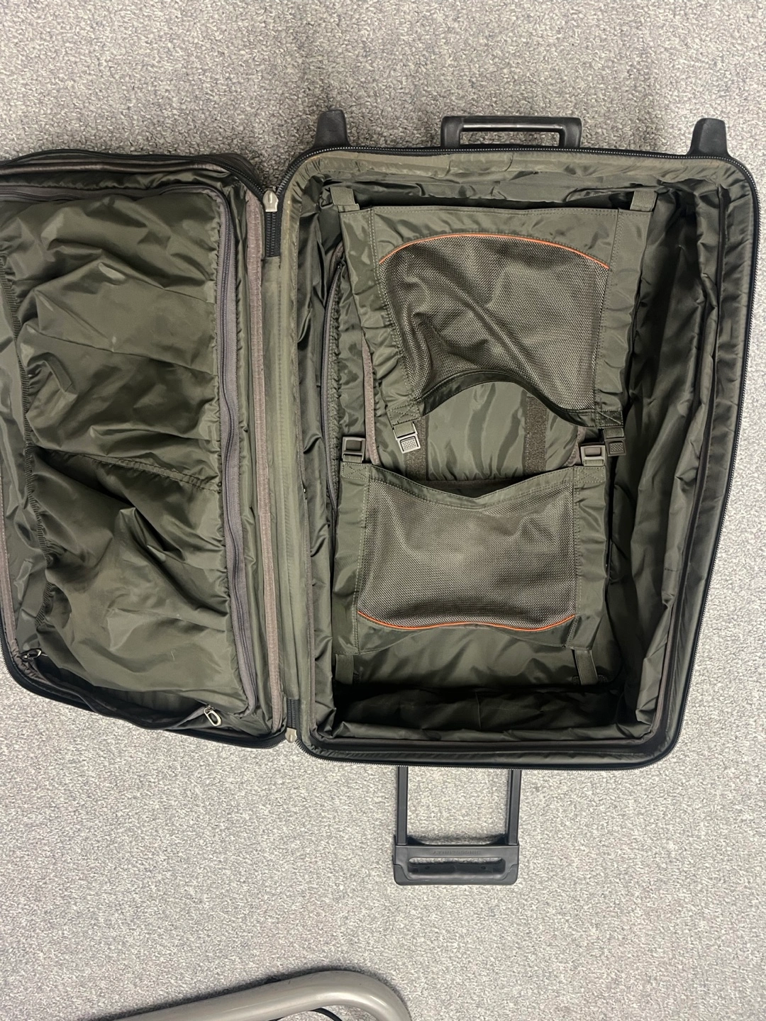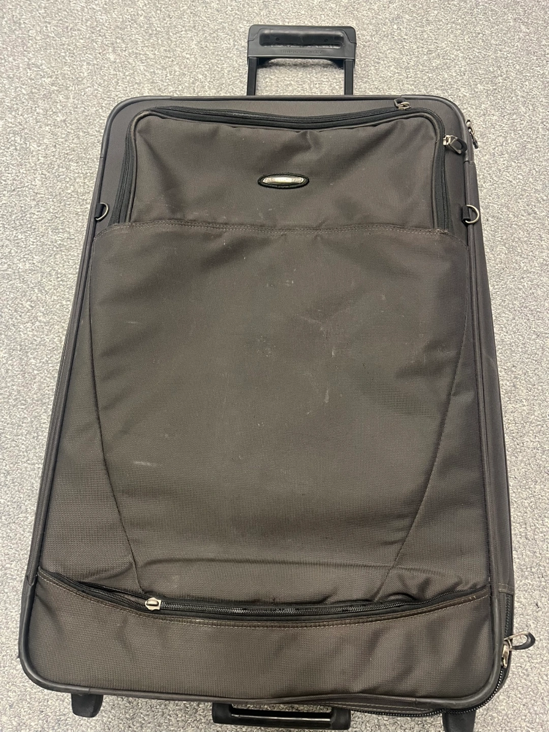 Large dark-green rolling suitcase. Multiple compartments and pockets. Excellent for travel. Features a retractable handle and wheels.