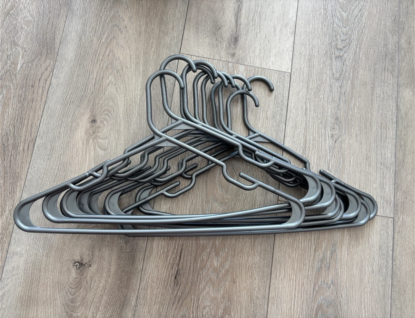 Ten grey plastic hangers for organizing your closet. They're made of durable plastic and have a simple, functional design.