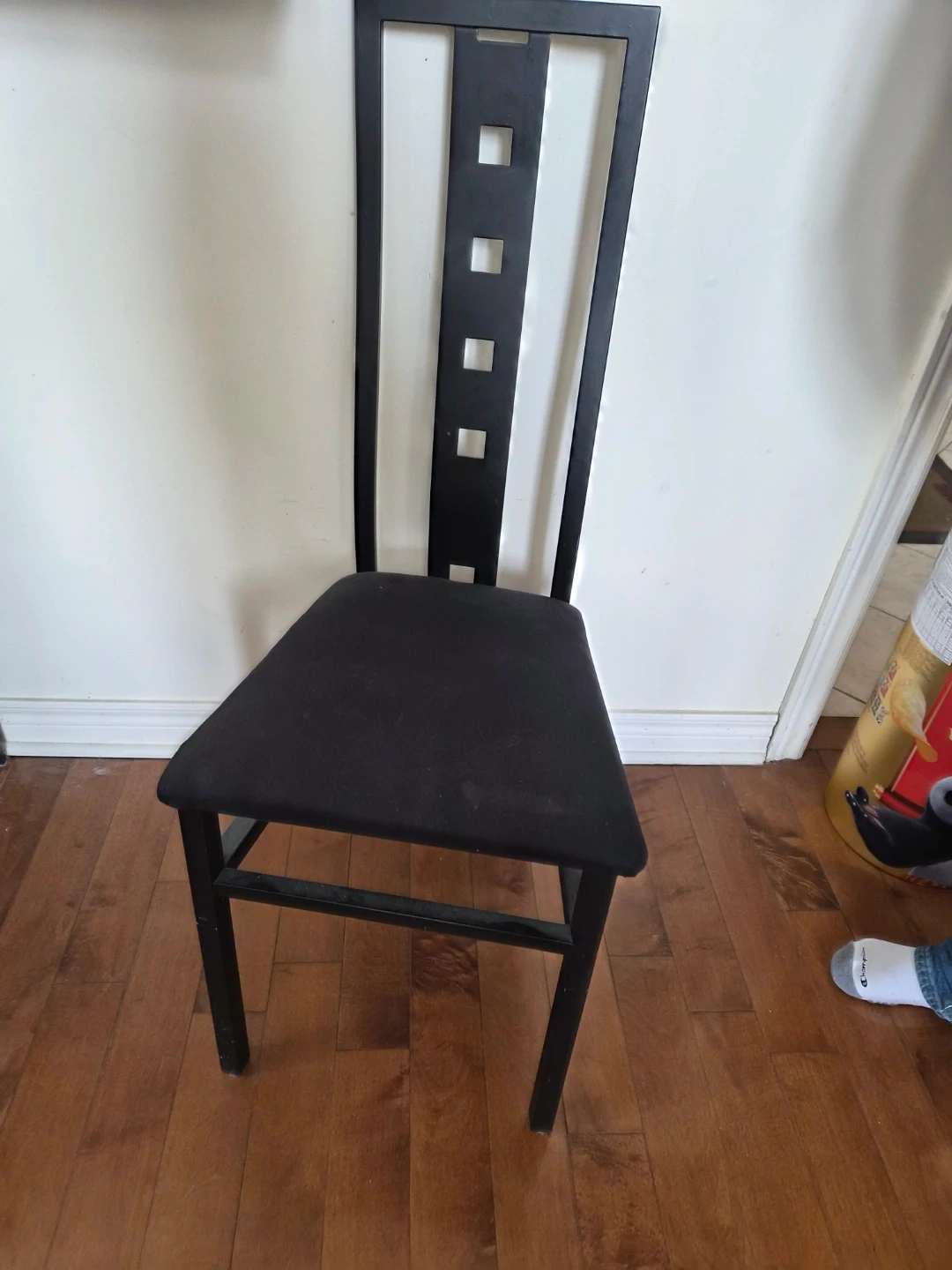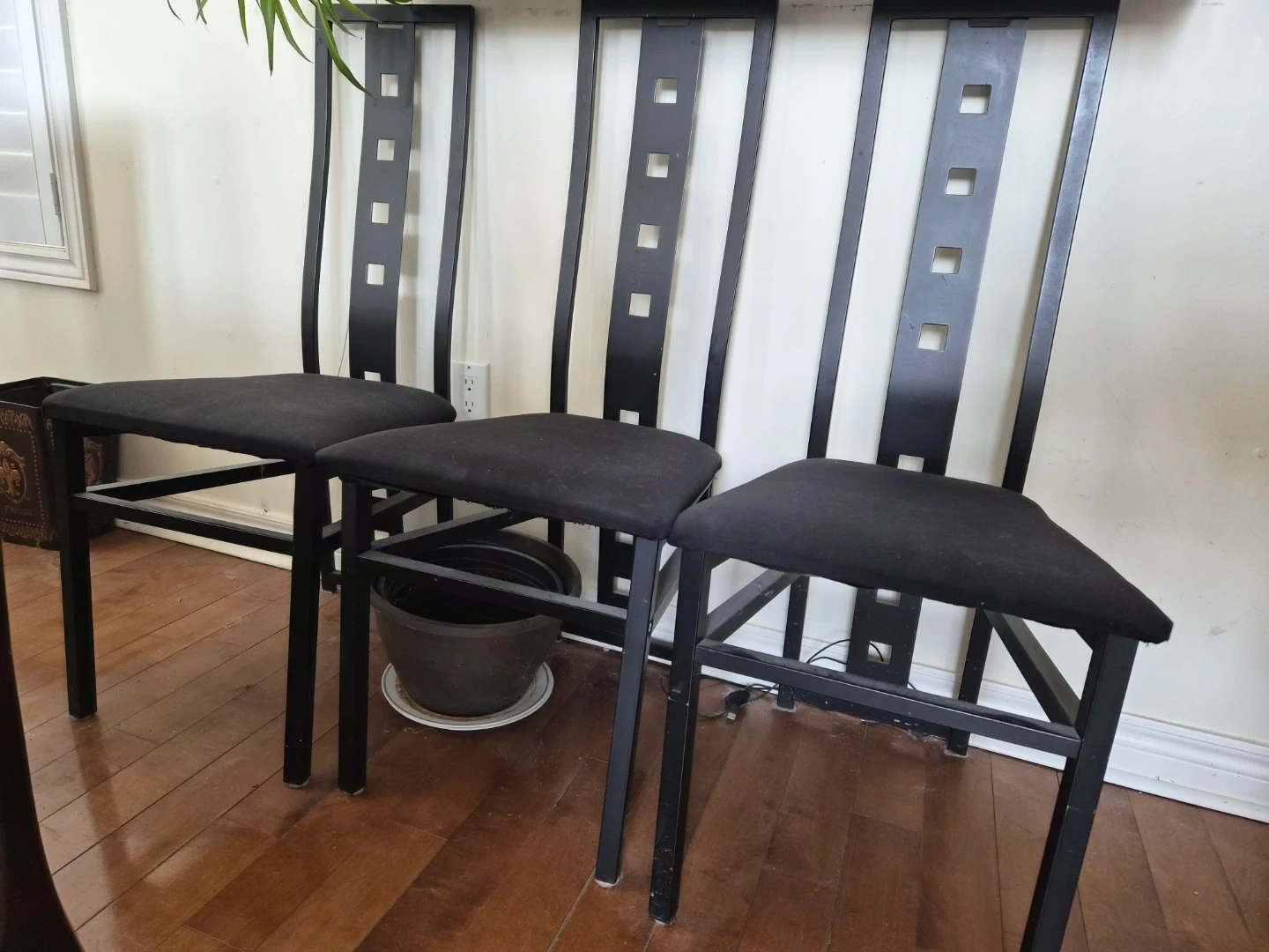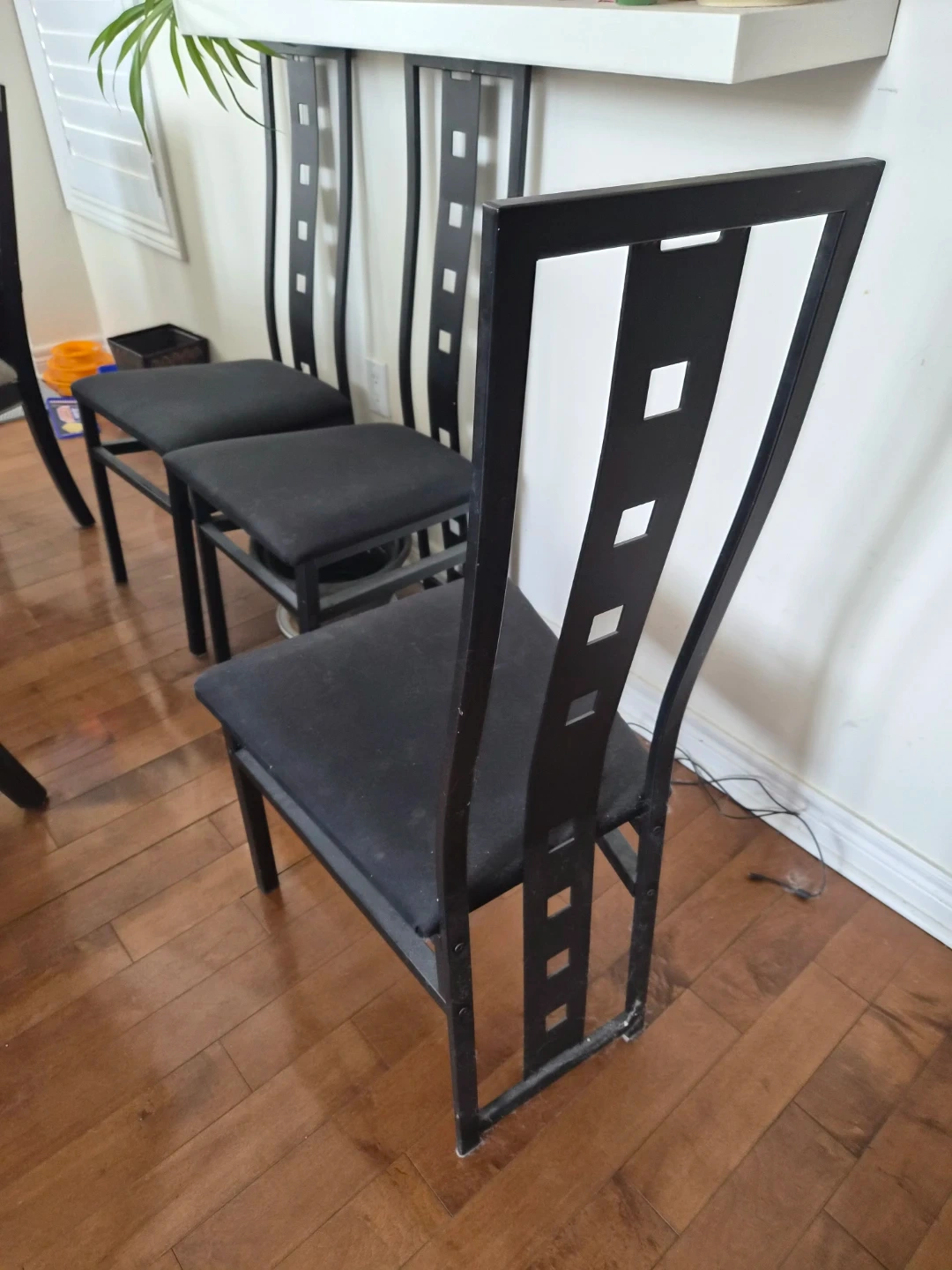 Three black dining chairs with upholstered seats and metal frames. The backrests have a decorative cut-out design. They're suitable for a dining table or as accent seating.