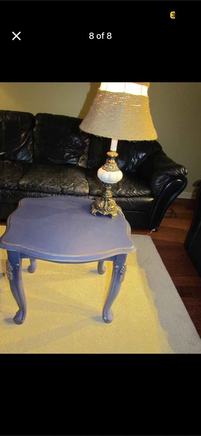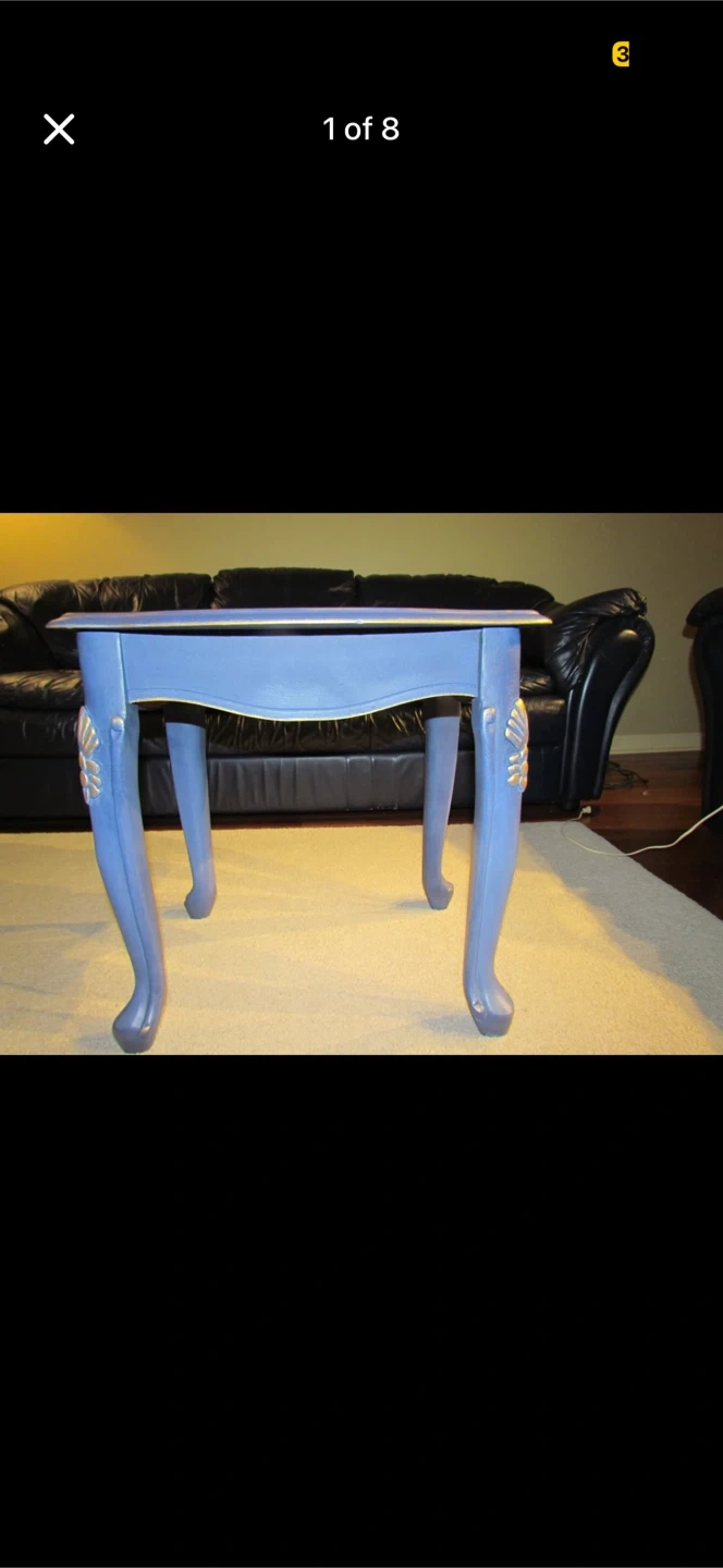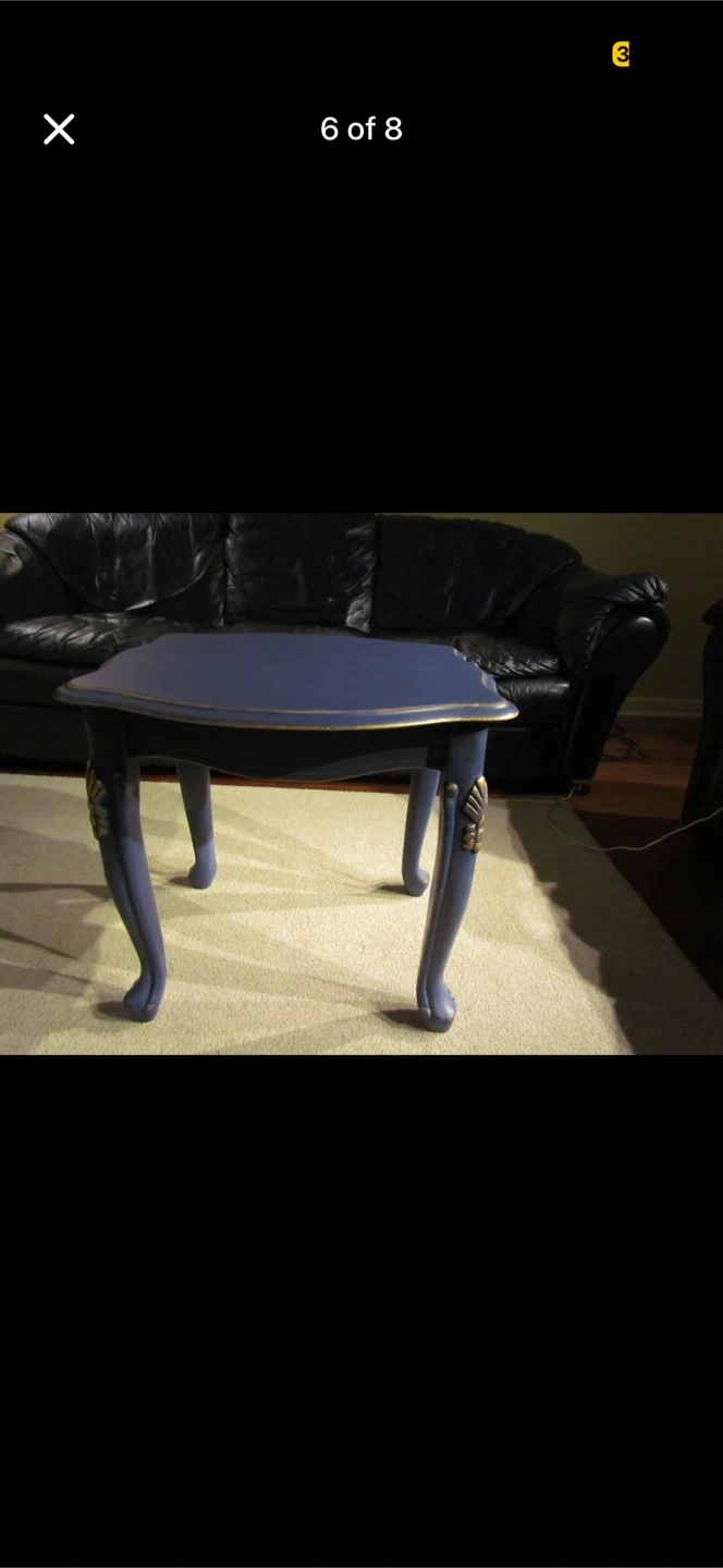 This is a charming blue accent table. It has elegant, carved legs with gold accents. Its compact size makes it handy for placing next to a sofa or armchair. It's a unique piece that adds a touch of vintage style to any room!