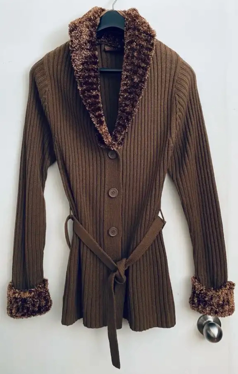 Brown ribbed knit cardigan. Features a faux fur collar and cuffs. Includes a self-tie belt. Size L/G.