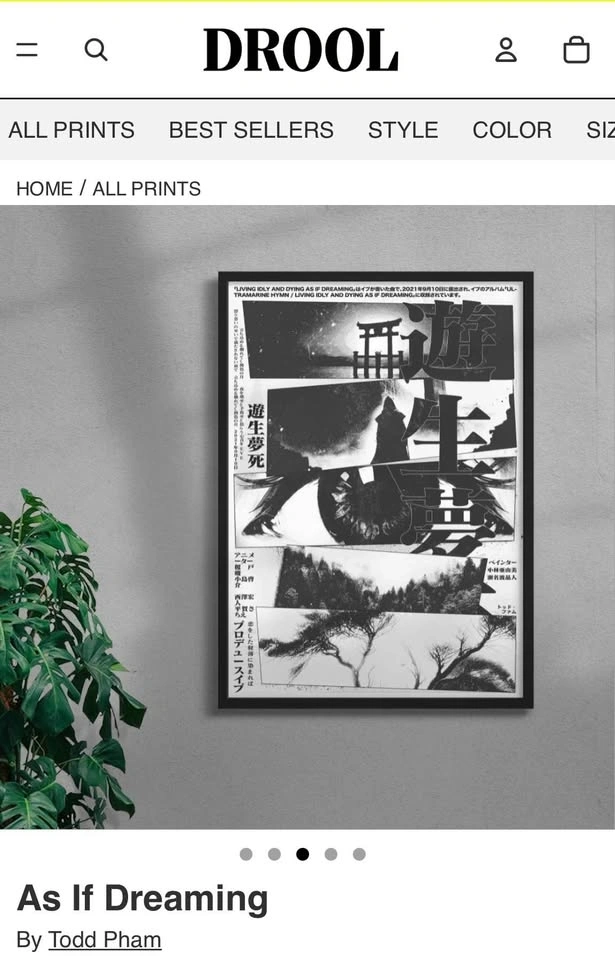 Independent art prints by Todd Pham from Drool Art. Both prints are black and white. One is 'If I Can Draw My Life' and the other is 'As If Dreaming'. Size A2. Frames available for an extra $20 (frame size 50x70).
