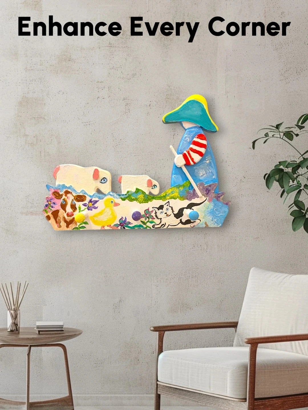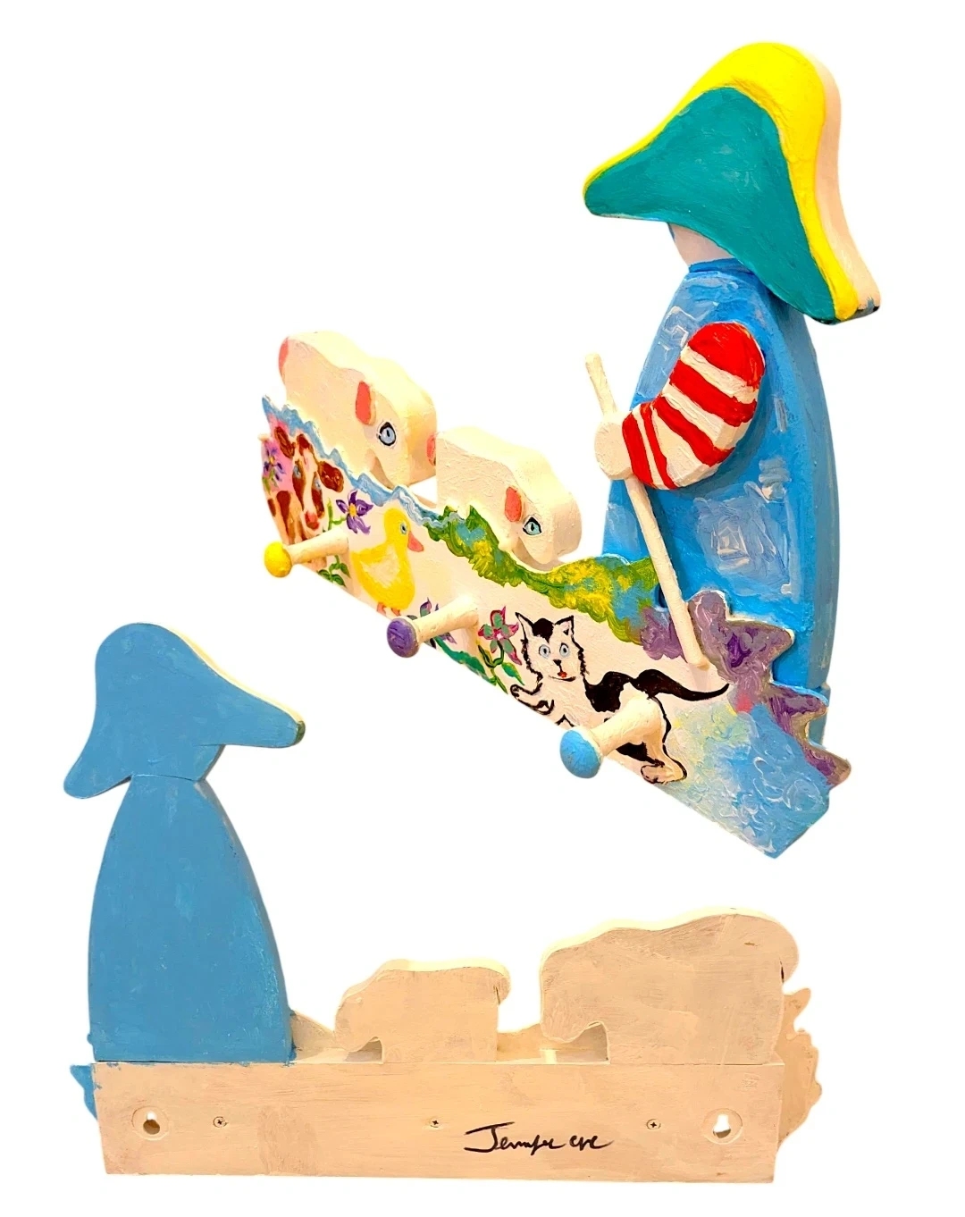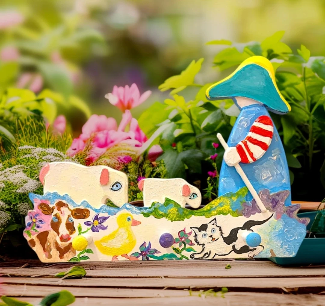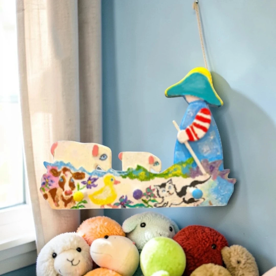 Add a touch of rustic charm to your home with this unique, handcrafted one of a kind wooden peg rack. Featuring a delightful, hand-painted scene with a Shepherd, Sheep, Cow, Cat, and Duck, this artisan piece is as functional as it is beautiful.