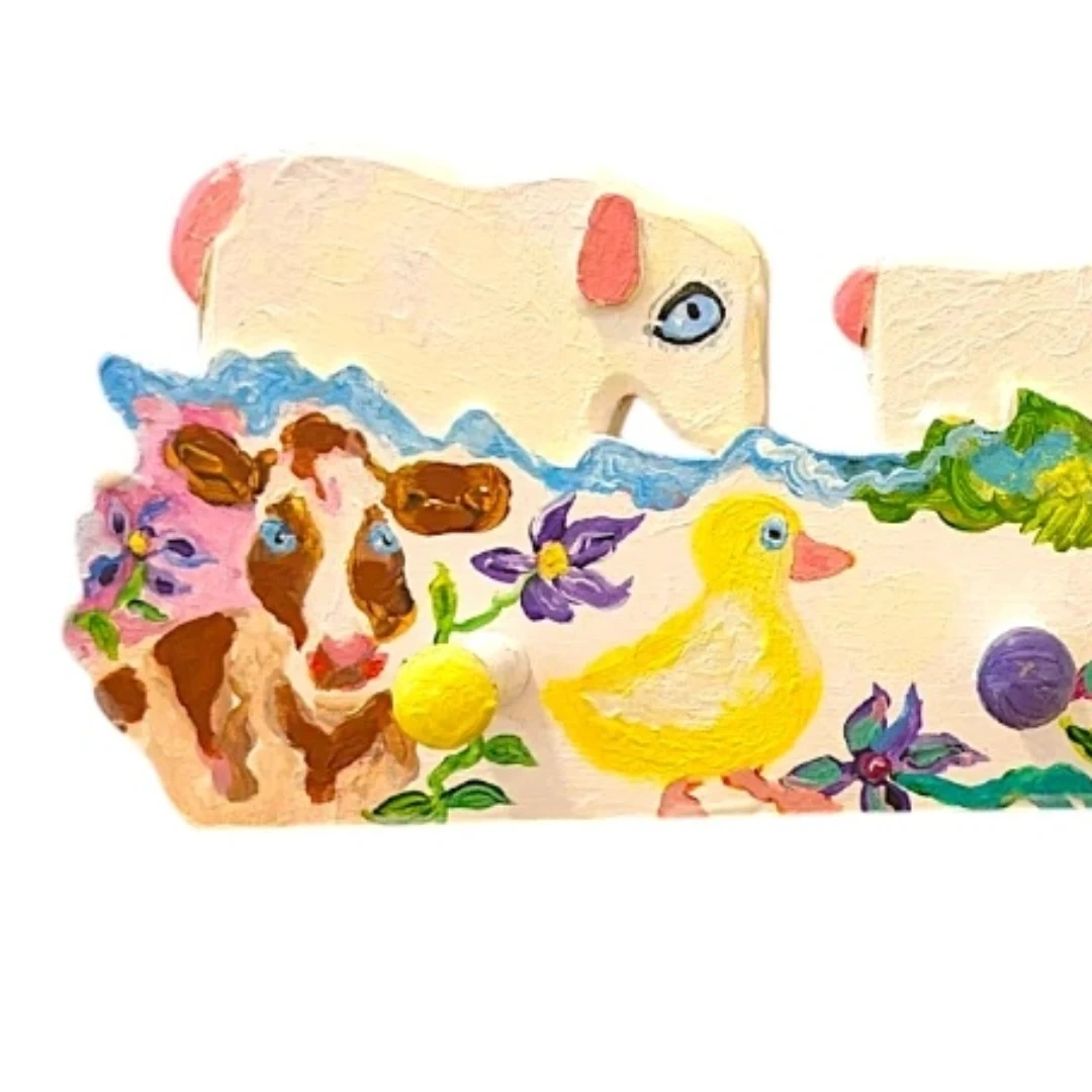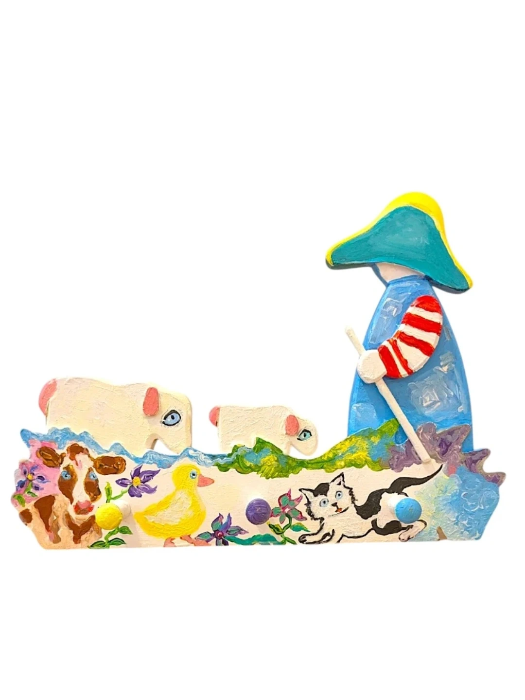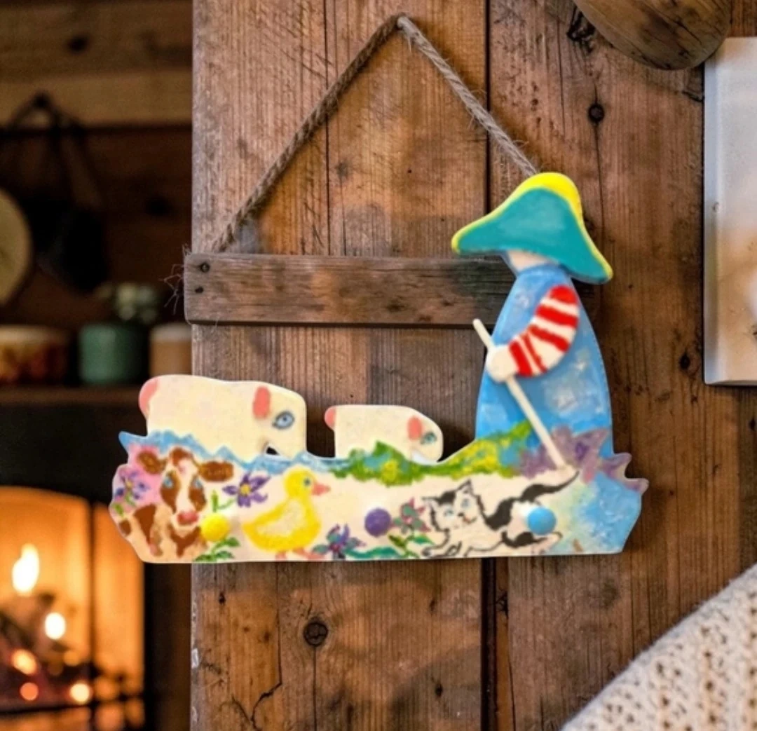 Add a touch of rustic charm to your home with this unique, handcrafted one of a kind wooden peg rack. Featuring a delightful, hand-painted scene with a Shepherd, Sheep, Cow, Cat, and Duck, this artisan piece is as functional as it is beautiful.