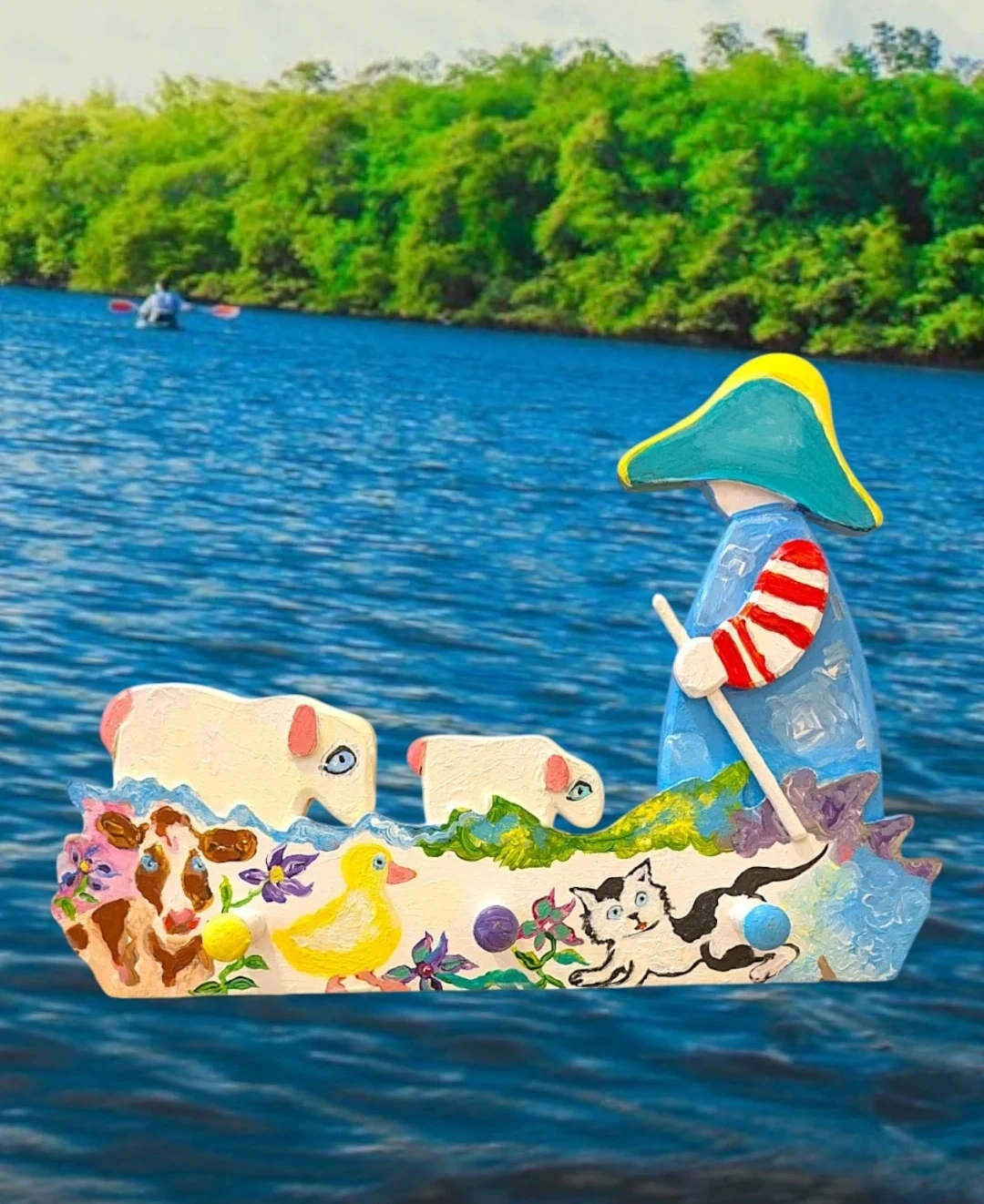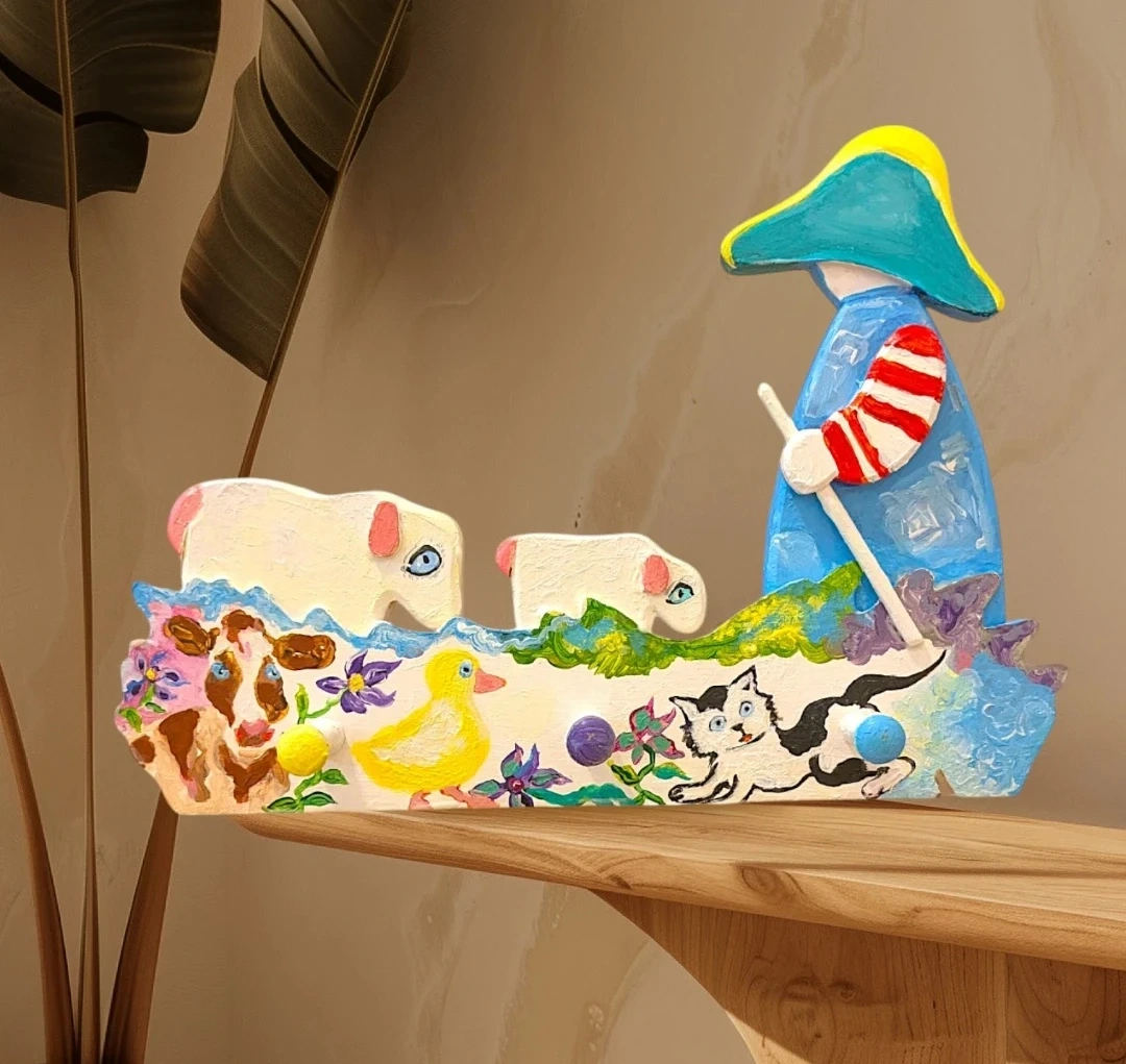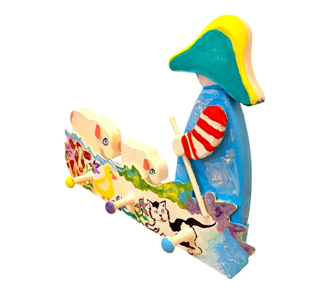 Add a touch of rustic charm to your home with this unique, handcrafted one of a kind wooden peg rack. Featuring a delightful, hand-painted scene with a Shepherd, Sheep, Cow, Cat, and Duck, this artisan piece is as functional as it is beautiful.