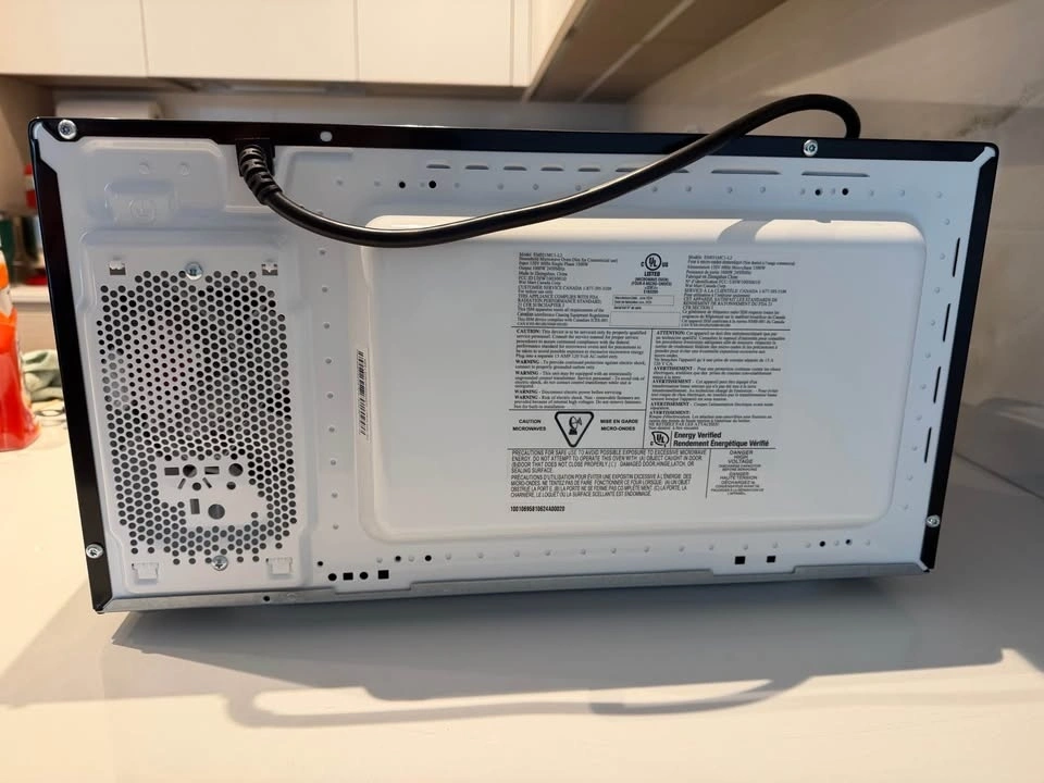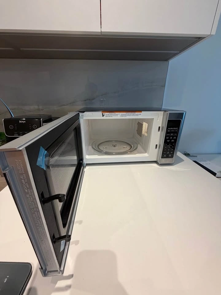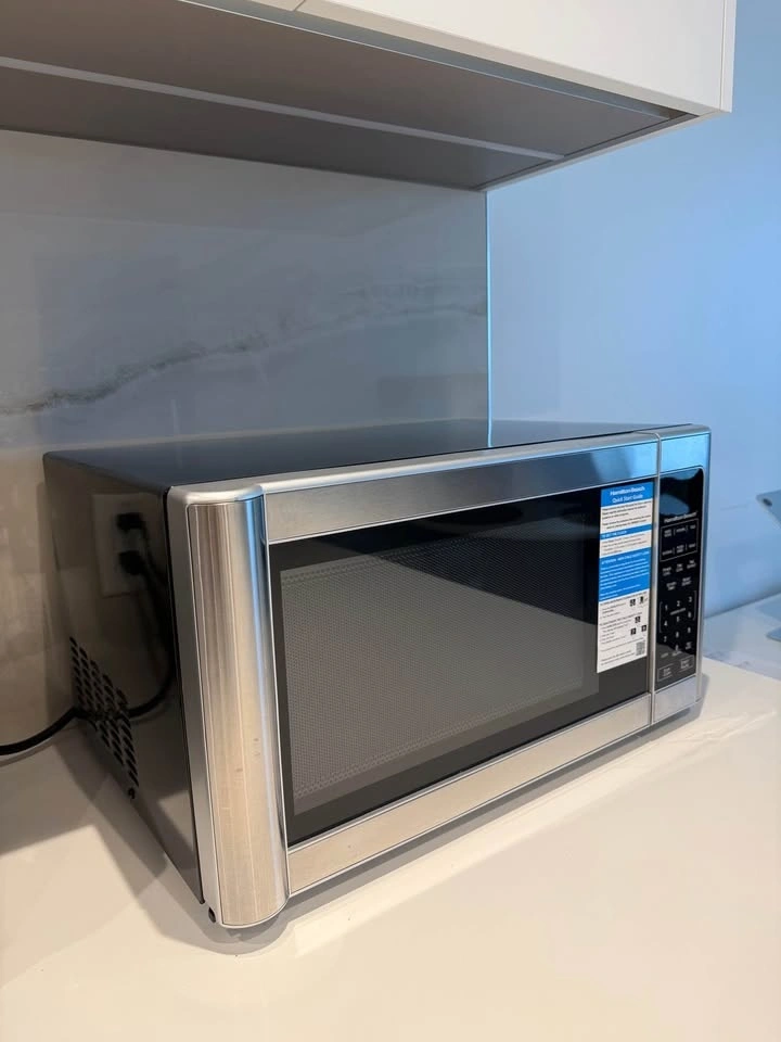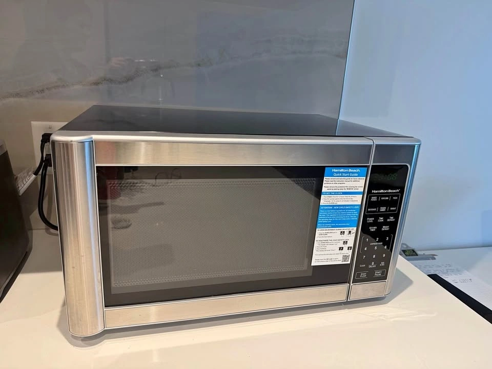 It's still pretty much new. I'm moving and won't need my microwave anymore. This is a Hamilton Beach countertop microwave with 1.1 cu ft capacity and 1000W power. It features a stainless steel front panel, a 12-inch turntable, and side-swing door. Functions include reheat and defrost. Pick up only.
