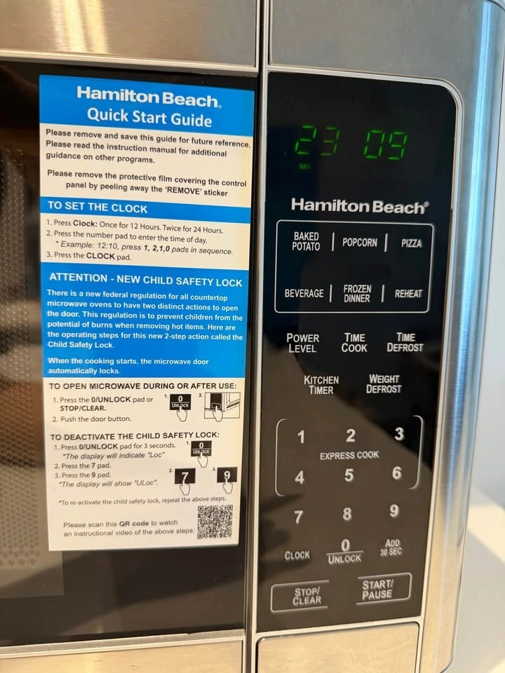 It's still pretty much new. I'm moving and won't need my microwave anymore. This is a Hamilton Beach countertop microwave with 1.1 cu ft capacity and 1000W power. It features a stainless steel front panel, a 12-inch turntable, and side-swing door. Functions include reheat and defrost. Pick up only.