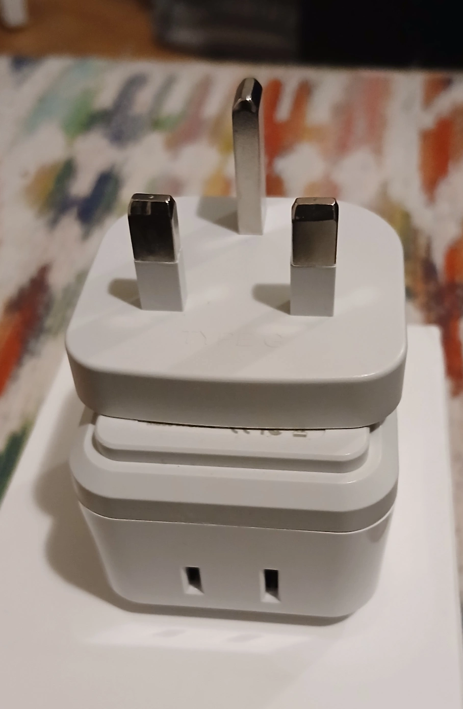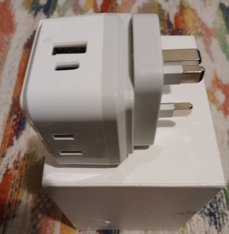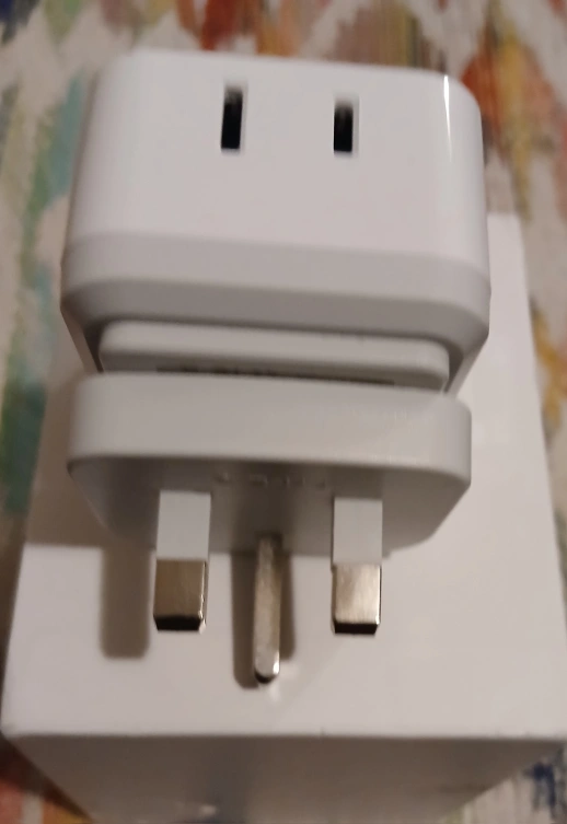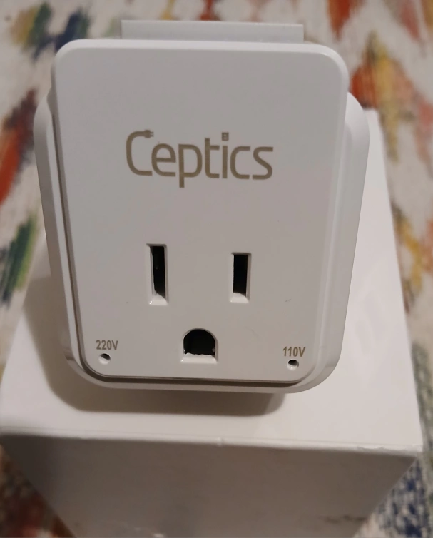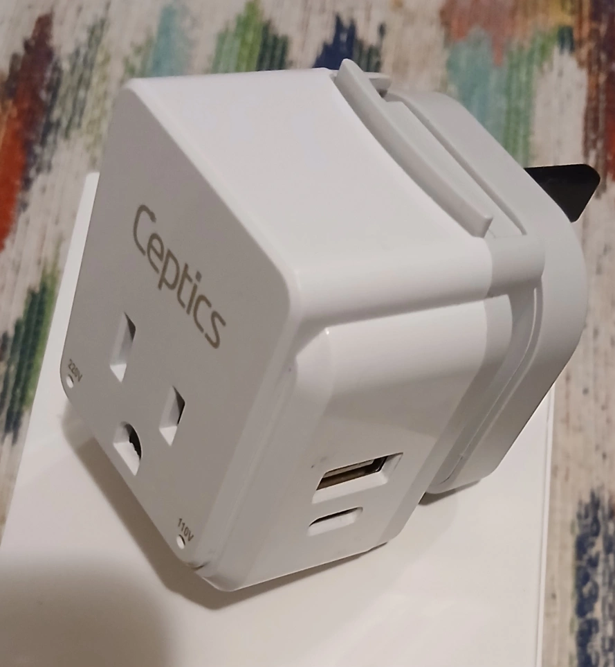 This Ceptics universal travel adapter has two USB ports for charging devices. It's suitable for use with 110V and 220V power sources. This adapter is great for travellers needing to charge multiple gadgets.