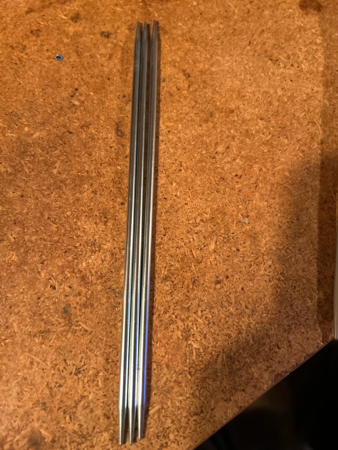 Set of three silver knitting needles. These are double-pointed knitting needles, perfect for small circumference knitting projects. They are made of metal. All are 7 inches long