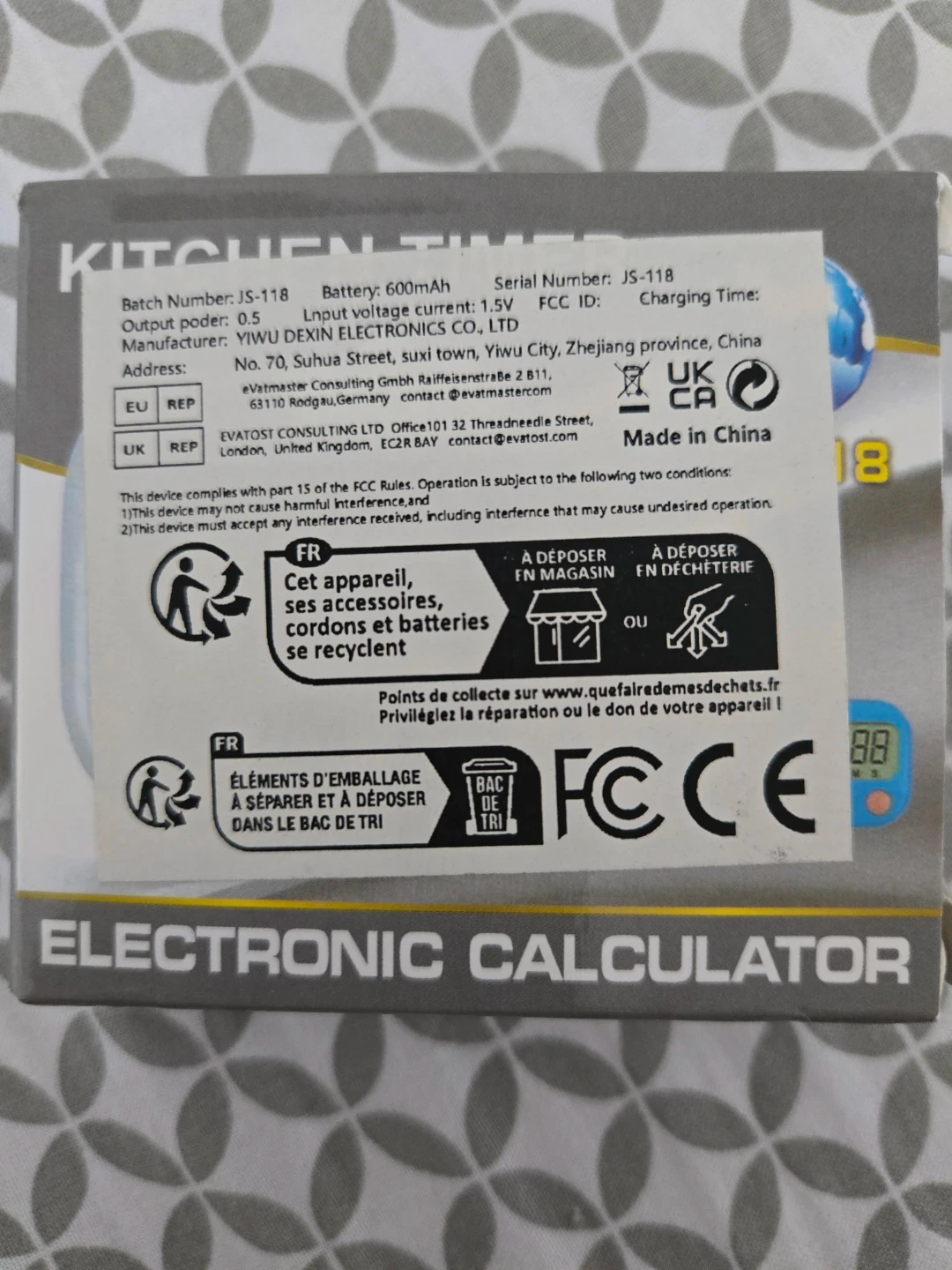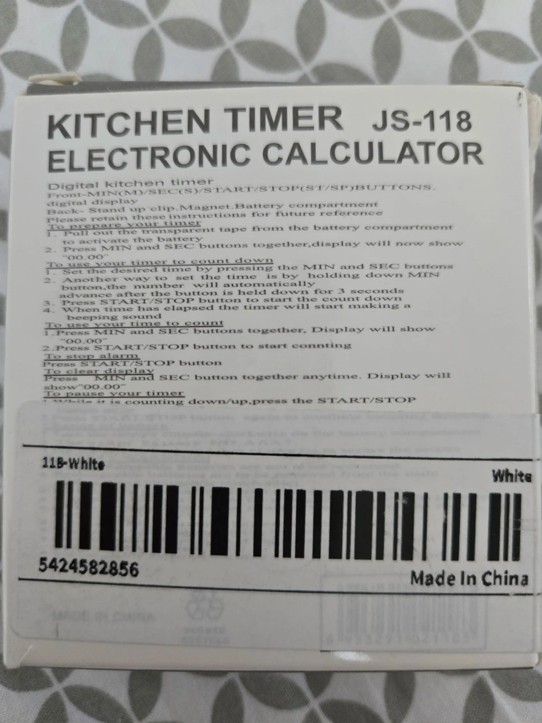 This is a Kitchen Timer JS-118 with electronic calculator functions. It features a digital display and a magnet for easy placement. The device is white in colour.