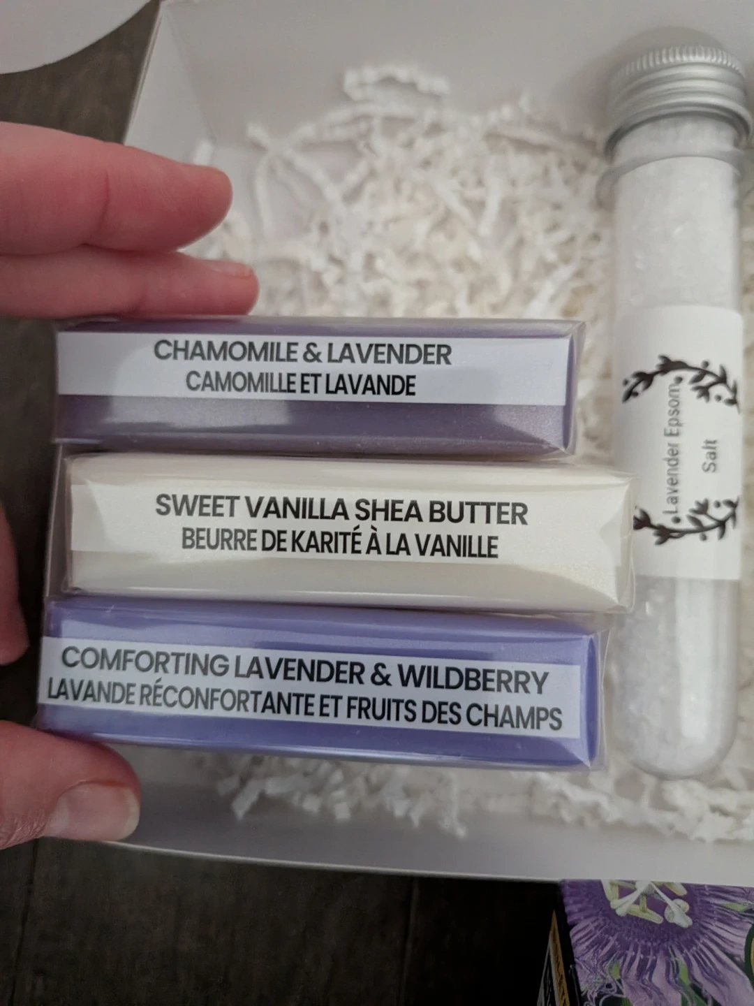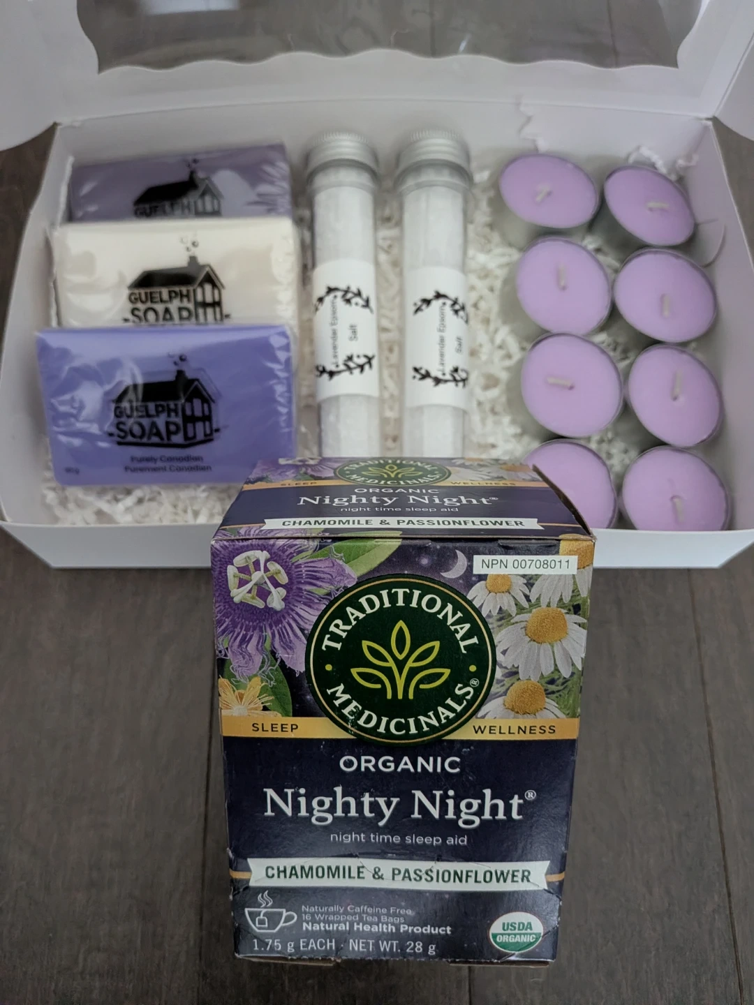 This gift set includes three handmade soaps: Chamomile & Lavender, Sweet Vanilla Shea Butter, and Comforting Lavender & Wildberry. It also features Traditional Medicinals Organic Nighty Night tea, two tubes of Lavender Epsom Salt, and eight lavender tea light candles. It's perfect for a relaxing evening at home!