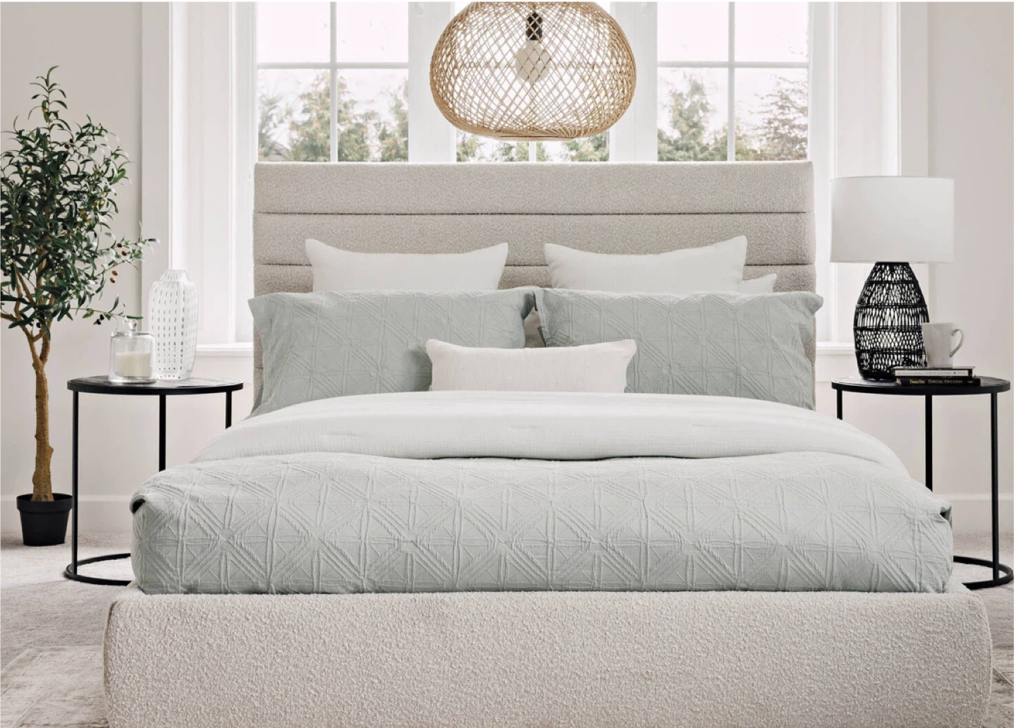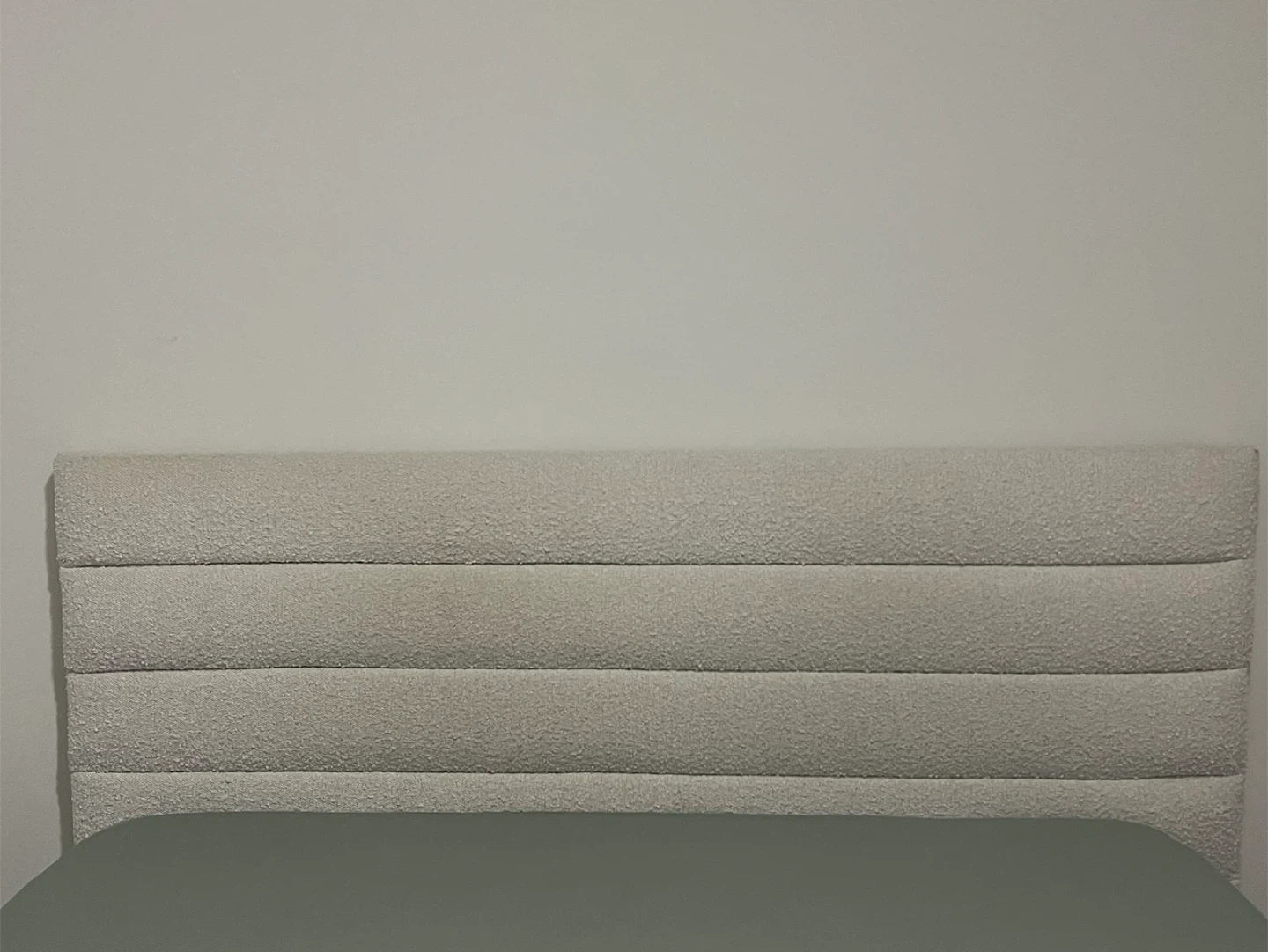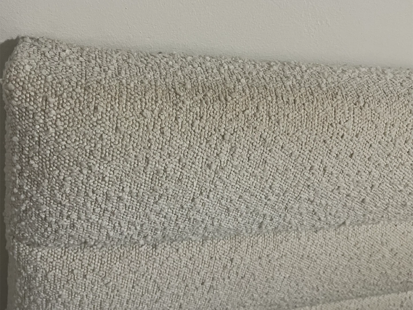 A stylish queen bed frame upholstered in boucle fabric. It's a great addition to any bedroom. Fabric is a light, neutral colour.