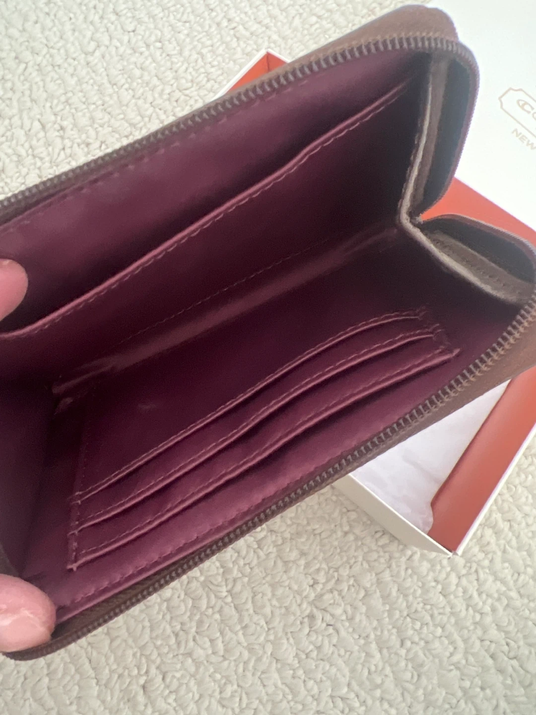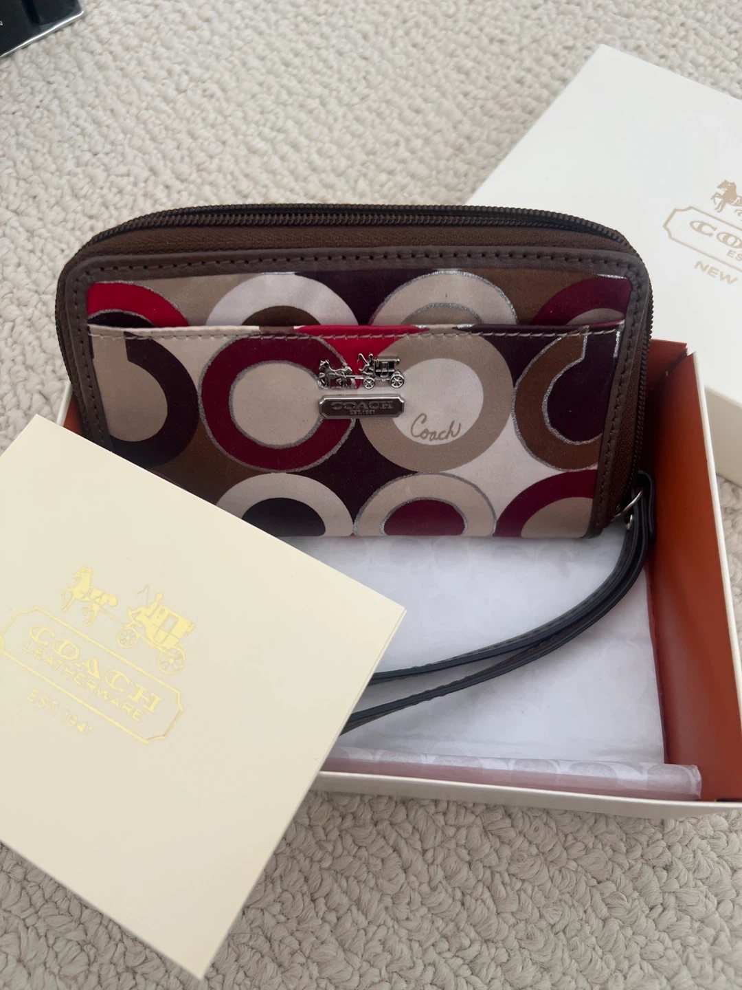 Coach wristlet wallet with a patterned exterior. It's brown with multicoloured circles and a burgundy interior. Features multiple card slots inside. Includes original box.