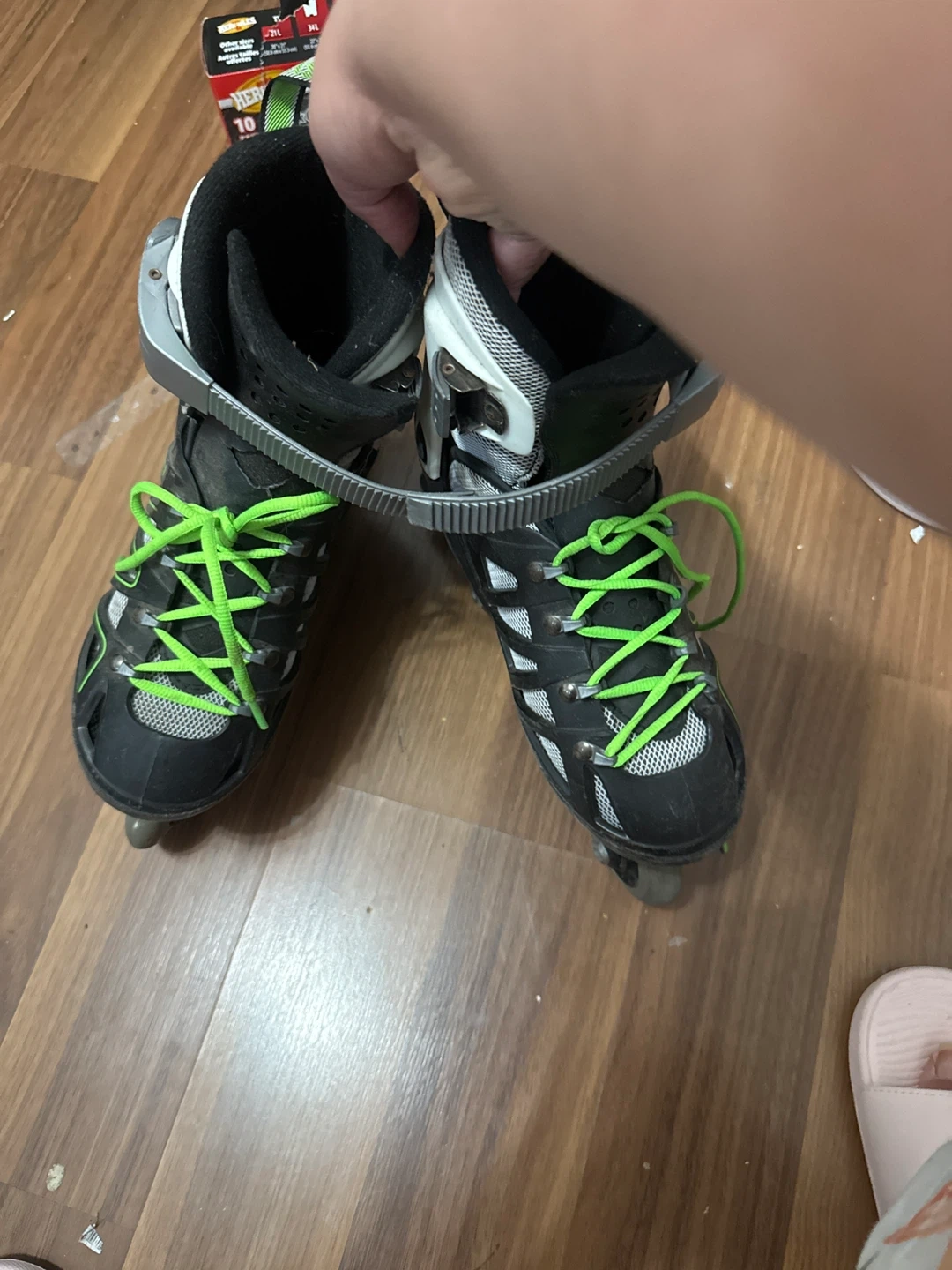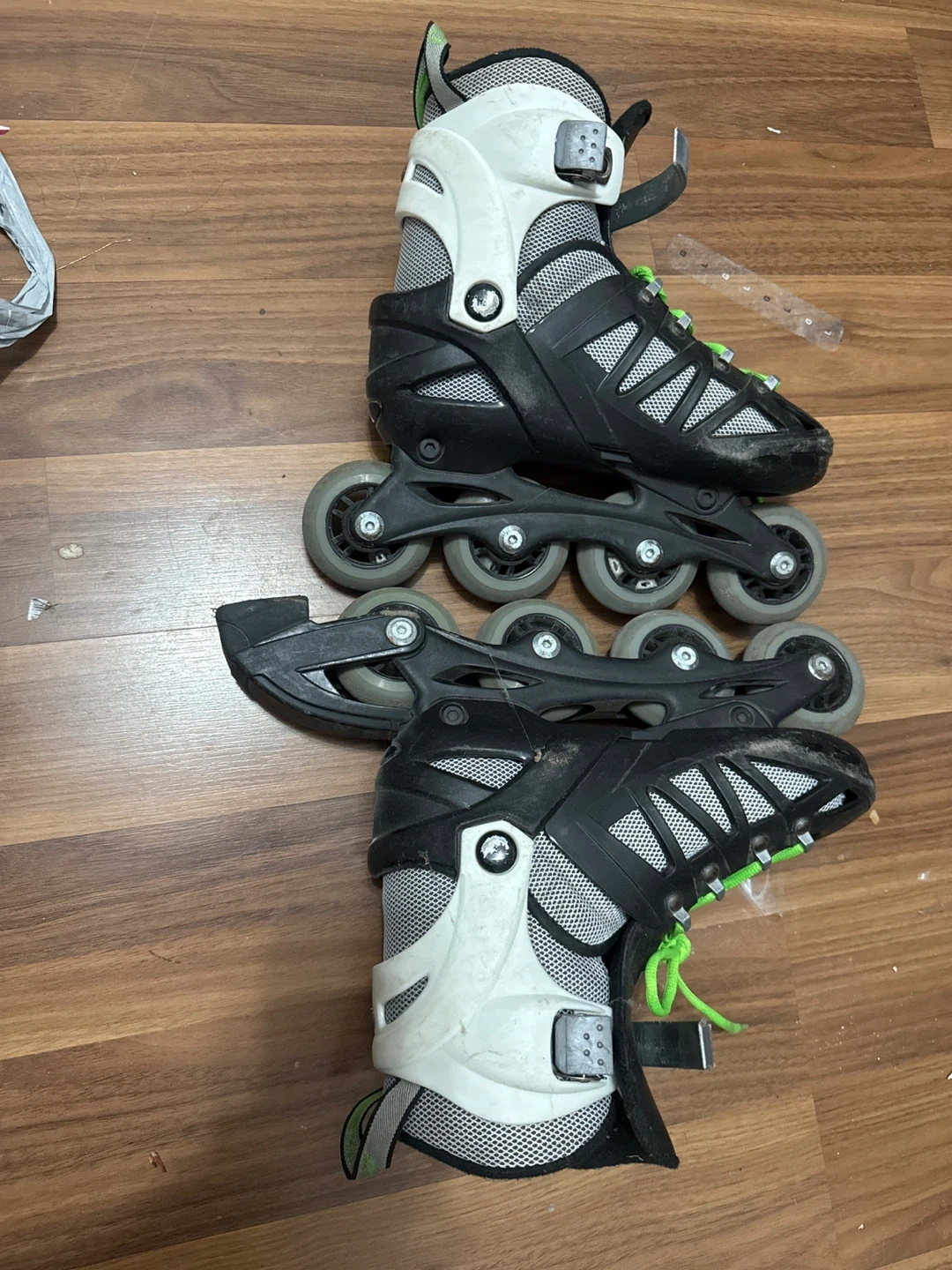 Pair of black and white Firefly inline skates with neon green laces. Adjustable buckle closure. Four wheels on each skate. Suitable for recreational skating.