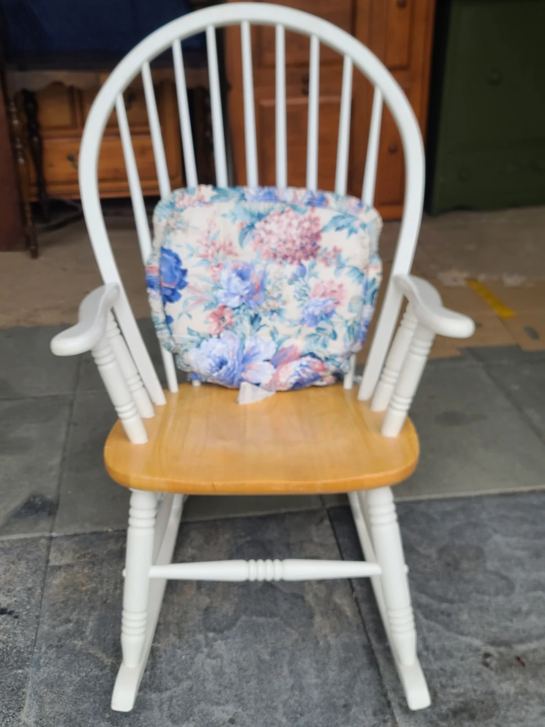 Charming white spindle rocking chair features a classic design with a comfortable floral print cushion. The seat is made of natural wood, offering a nice contrast to the painted frame. It's great for a nursery or any cozy corner of your home! Delivery can be arranged. Viewing and pickup by appointment.