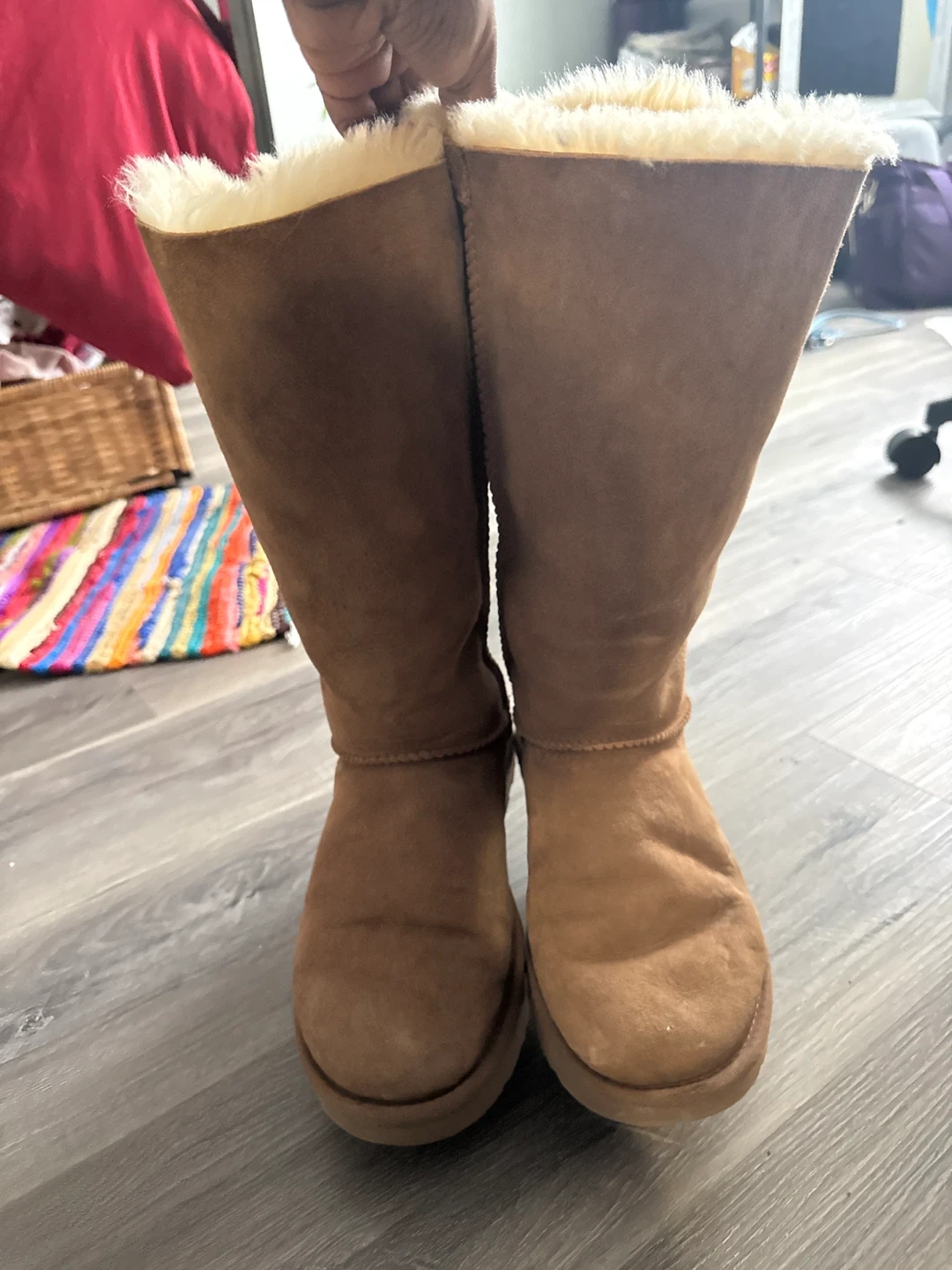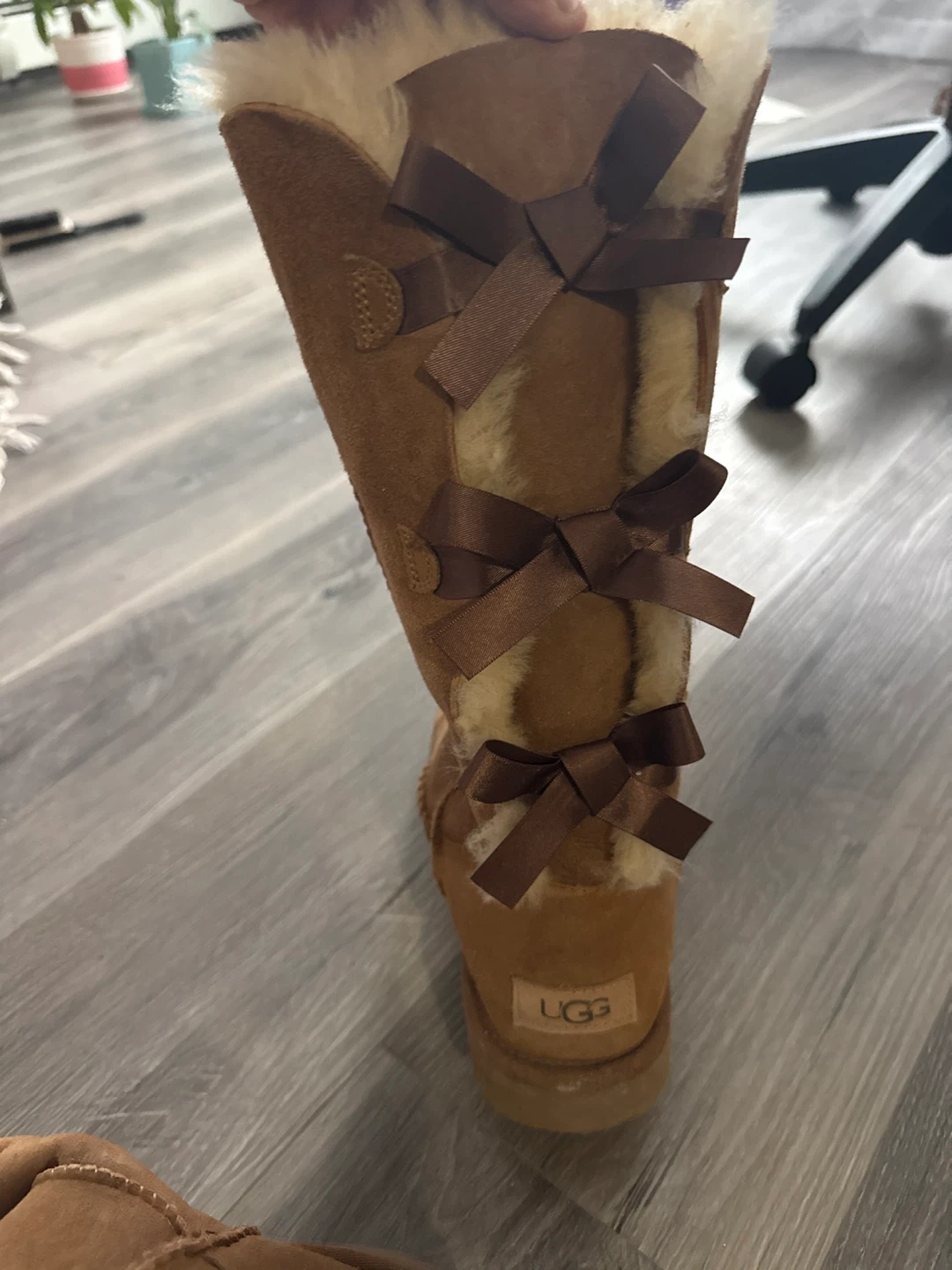 These UGG Canada tall boots are a warm brown suede with fluffy shearling lining. They feature decorative brown satin bows up the back shaft. Perfect for keeping your feet cosy on chilly days!