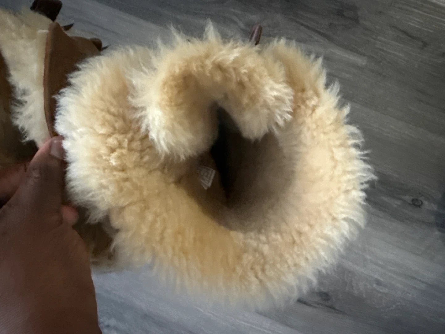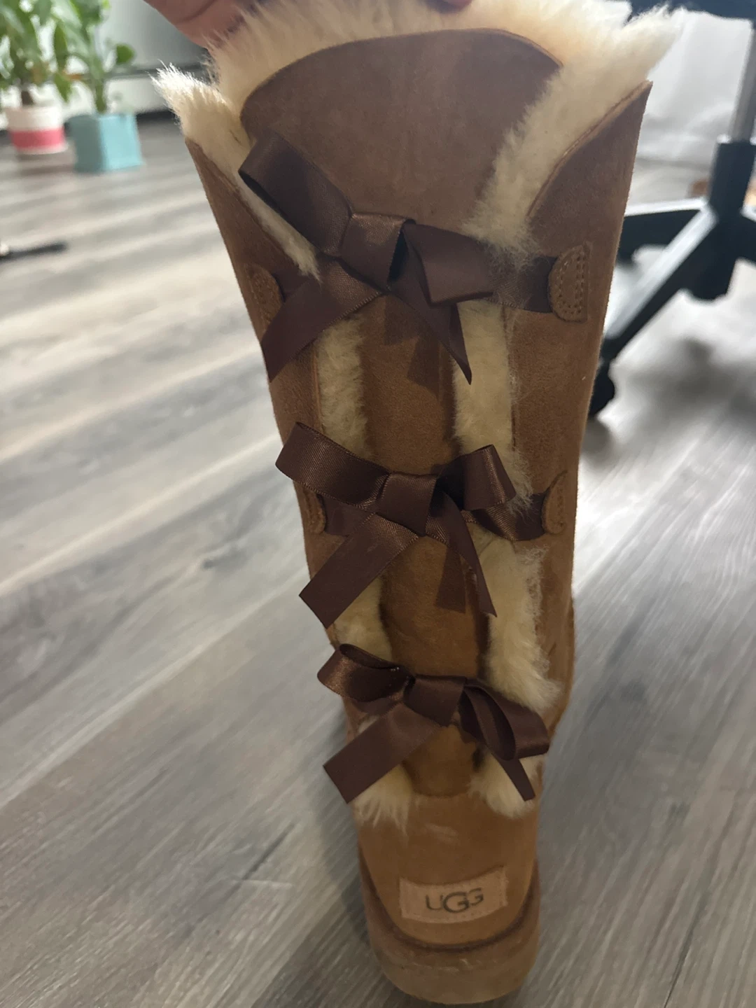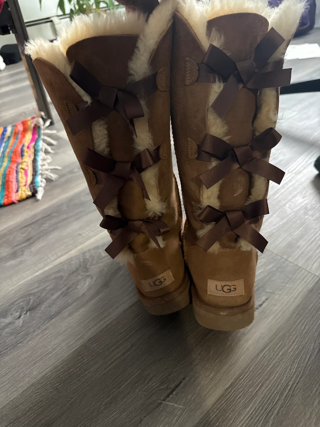 These UGG Canada tall boots are a warm brown suede with fluffy shearling lining. They feature decorative brown satin bows up the back shaft. Perfect for keeping your feet cosy on chilly days!