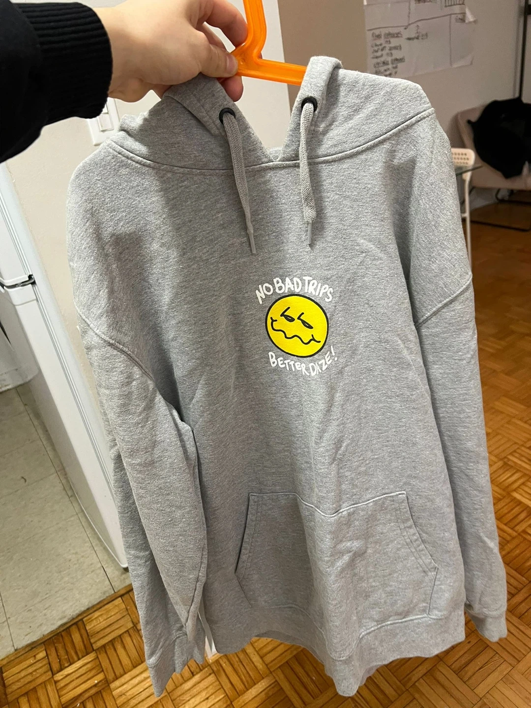 Grey Vans hoodie with "No Bad Trips Better Daze" graphic on the front and "Off The Wall" logo on the back. Features a drawstring hood and front pouch pocket. Cotton blend material. Amazing material and fit.