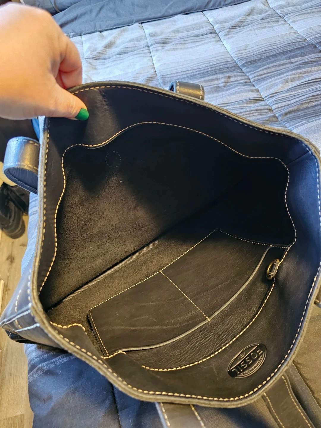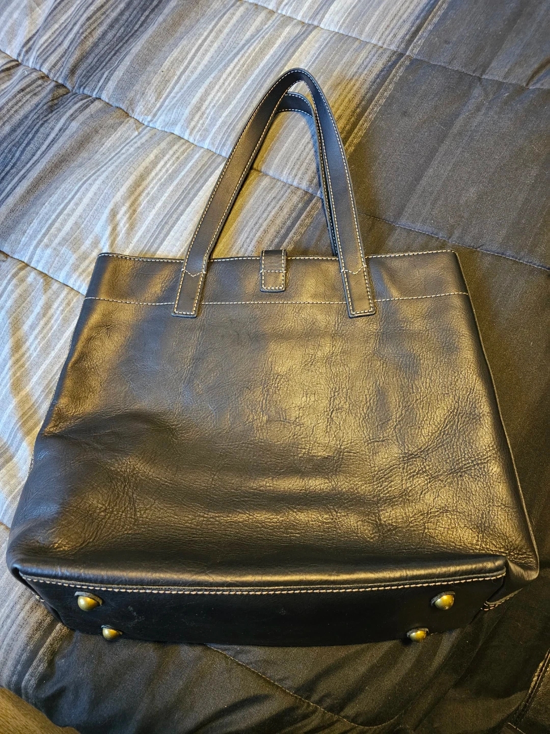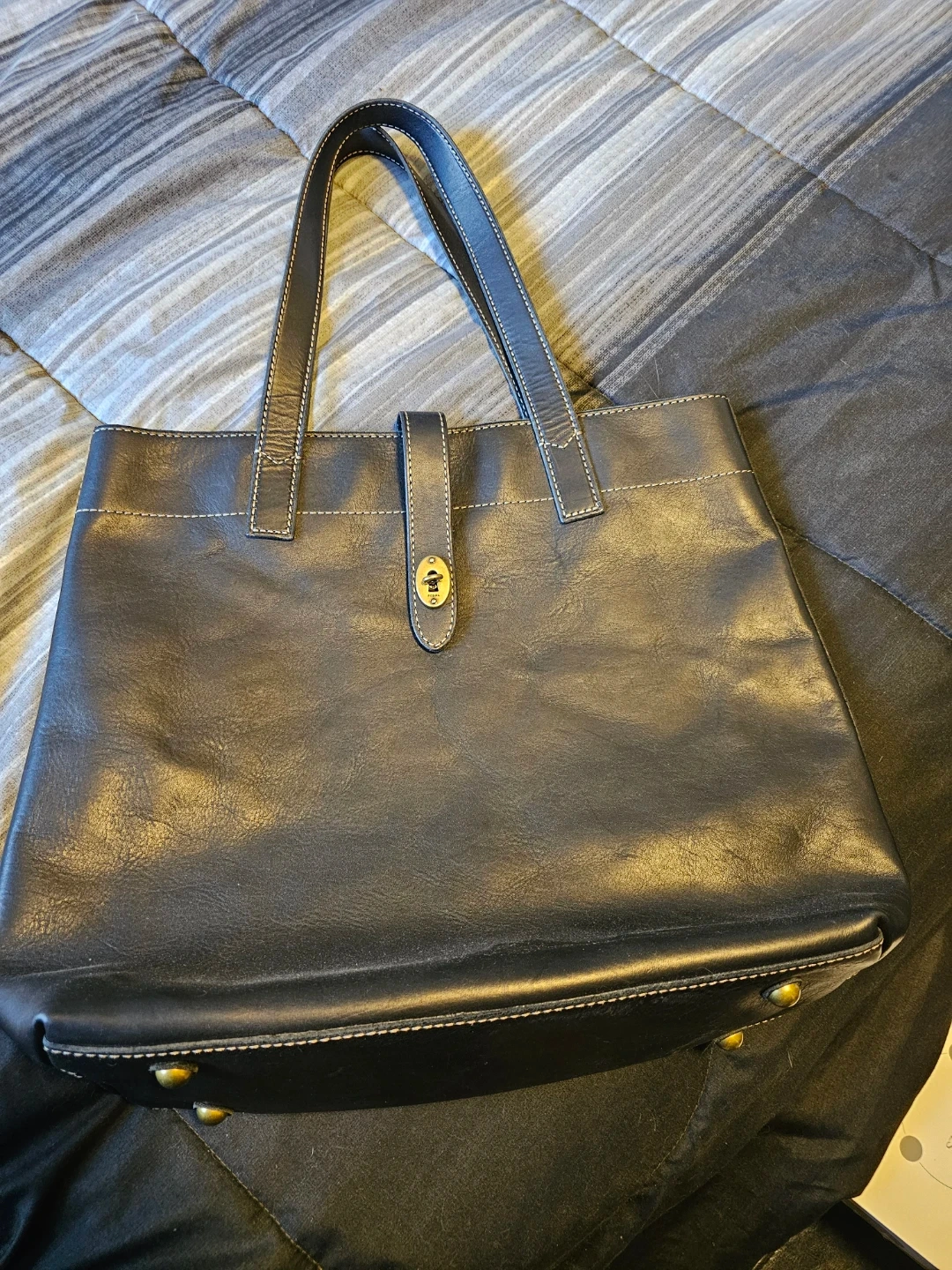 Classic black leather tote bag from Fossil. It's got a simple design with white contrast stitching. The interior features a few pockets for organization.