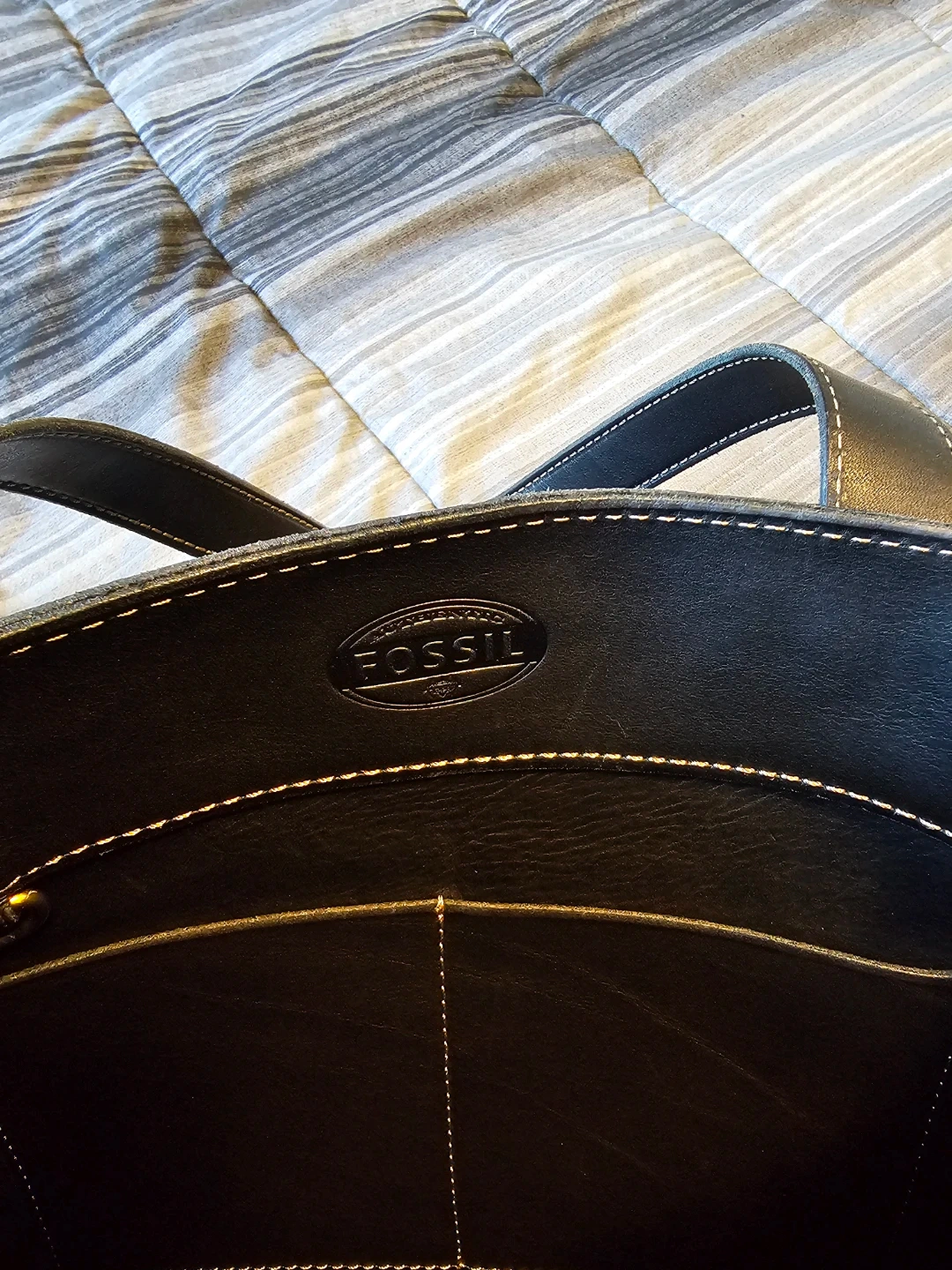 Classic black leather tote bag from Fossil. It's got a simple design with white contrast stitching. The interior features a few pockets for organization.