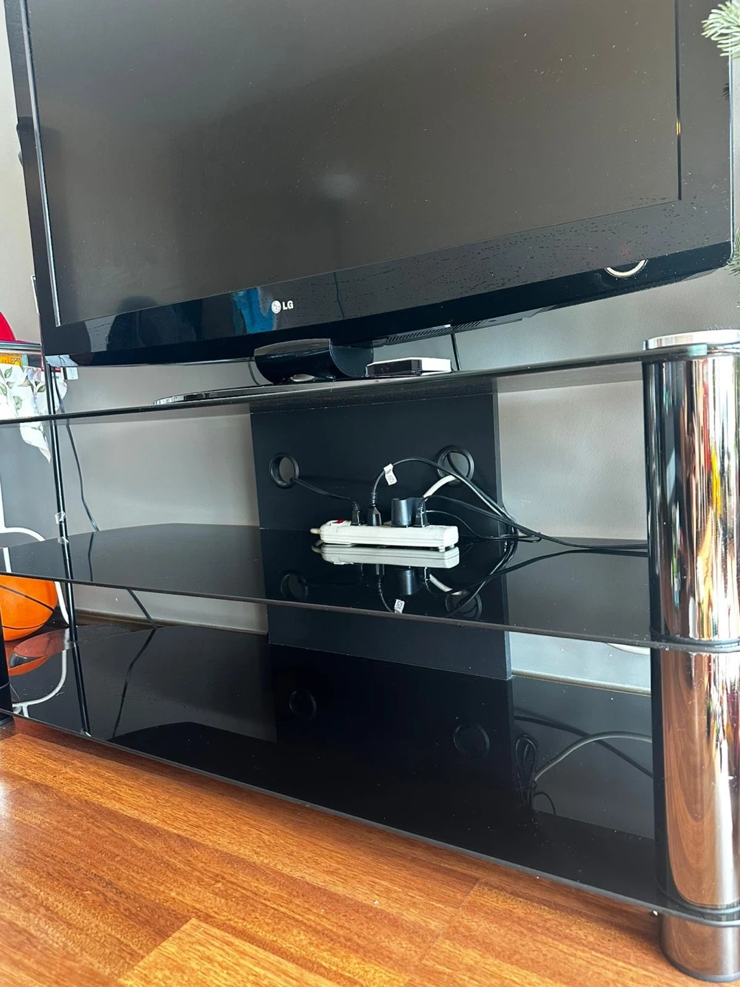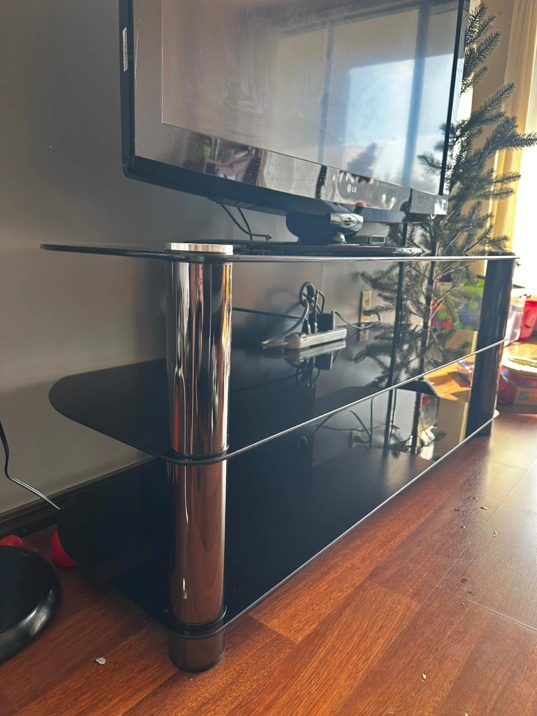 MOVING OUT SALE Black Glass TV Stand with Chrome Legs include TV