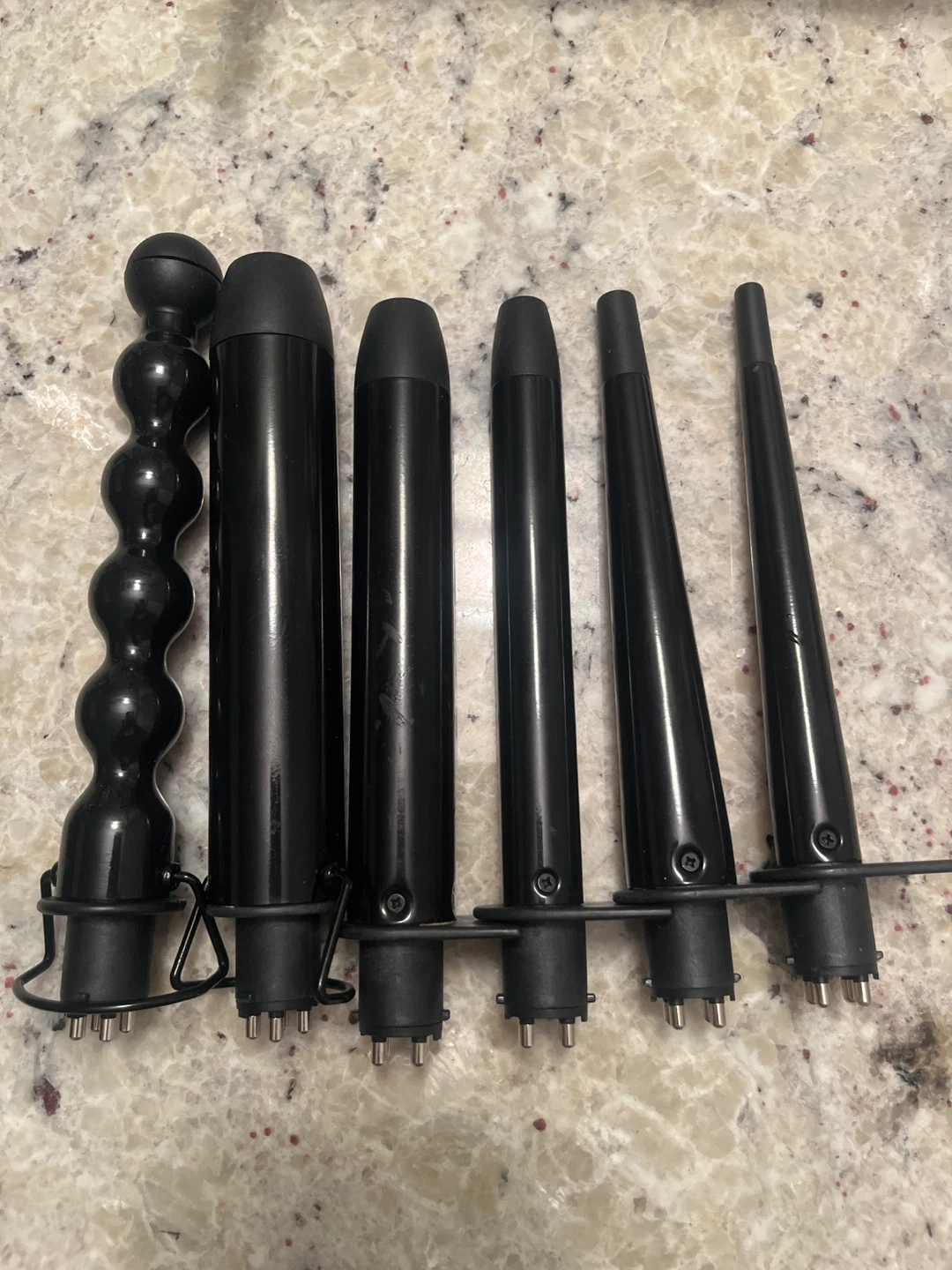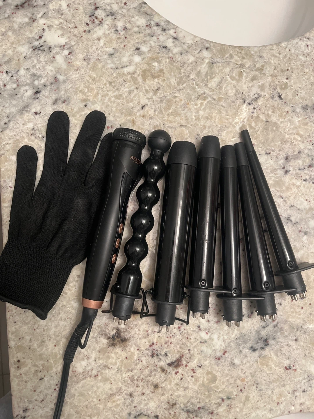 This is a 5-in-1 ceramic curling wand set from BESTOPE. It comes with five interchangeable barrels for different curl styles and a heat-resistant glove. The barrels include a bubble wand, a 25mm cone, a 19mm cone, a 13-25mm cone, and a 25mm cone.