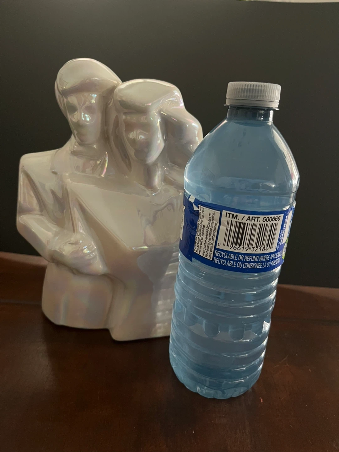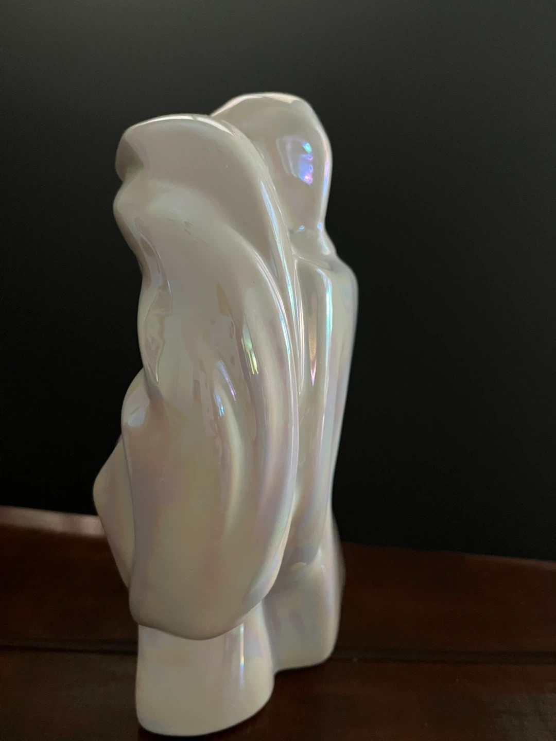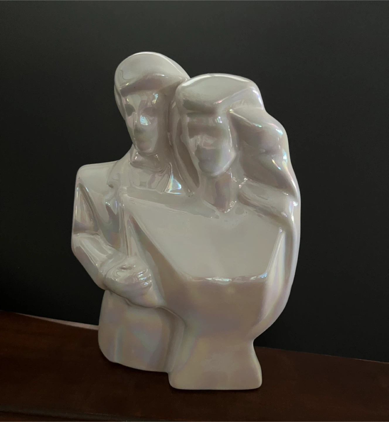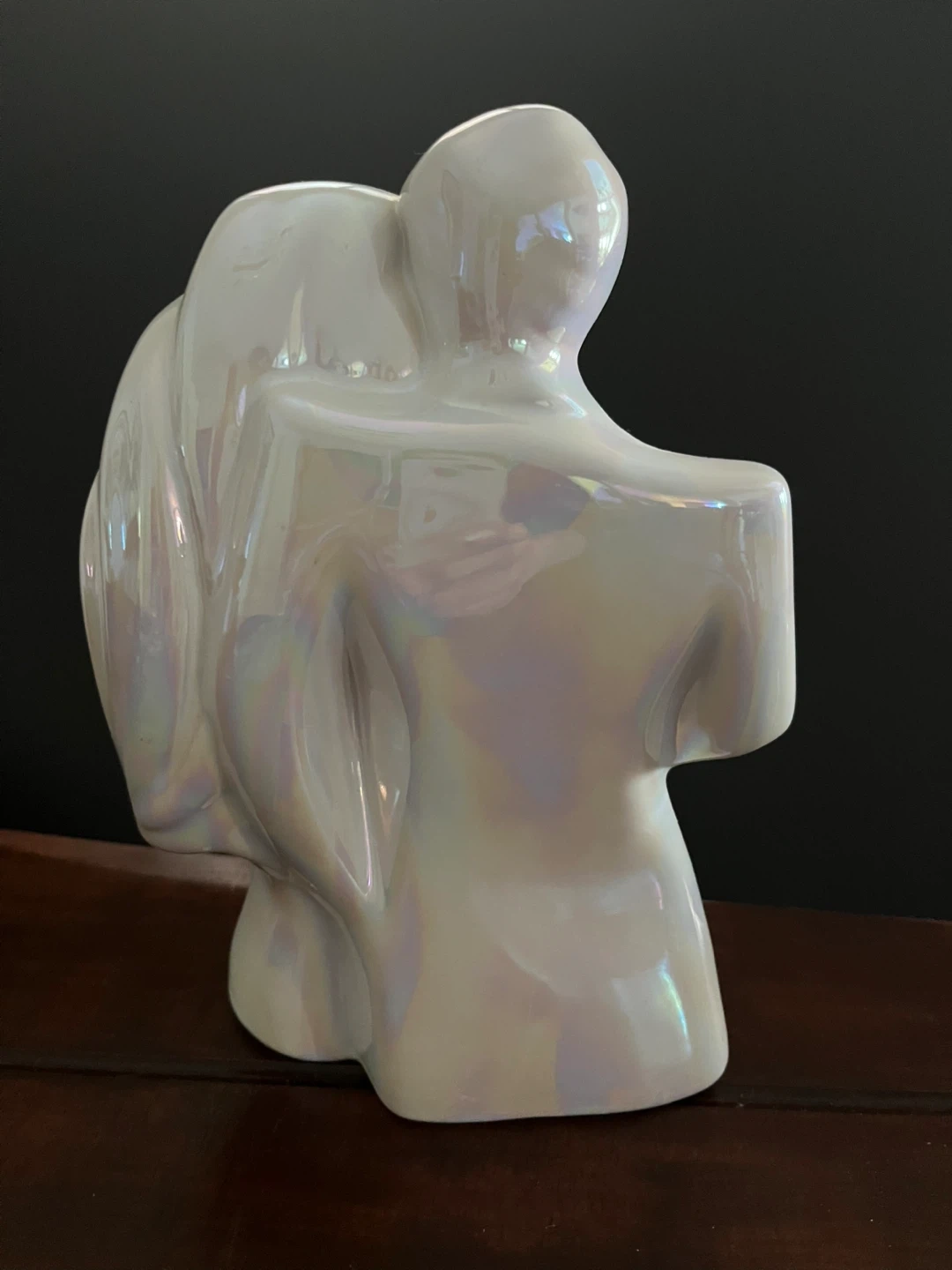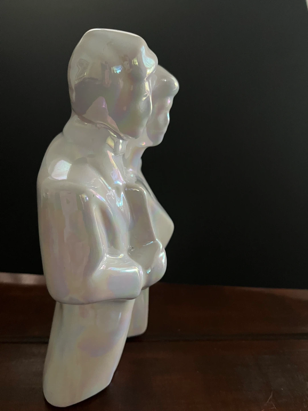 A beautiful pearlescent figurine depicting a couple. It's made of ceramic with an iridescent finish. This piece adds a touch of elegance to any home decor. Perfect for display on a shelf or mantelpiece!
