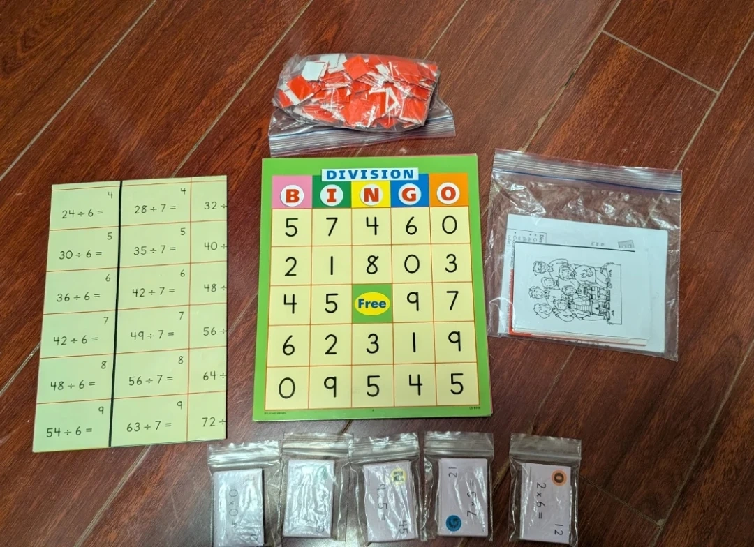 This educational game set includes boards and cards for both multiplication and division bingo. It's designed to help kids practice their math skills in a fun way. Cards and boards are included for both games.