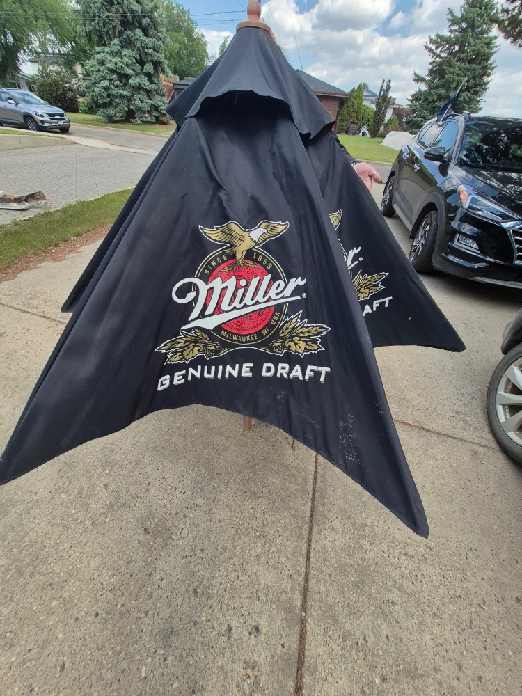 A large black umbrella, perfect for keeping you cool on sunny days. Featuring the Miller Genuine Draft logo, it appears to be well-maintained and ready for your next outdoor adventure.