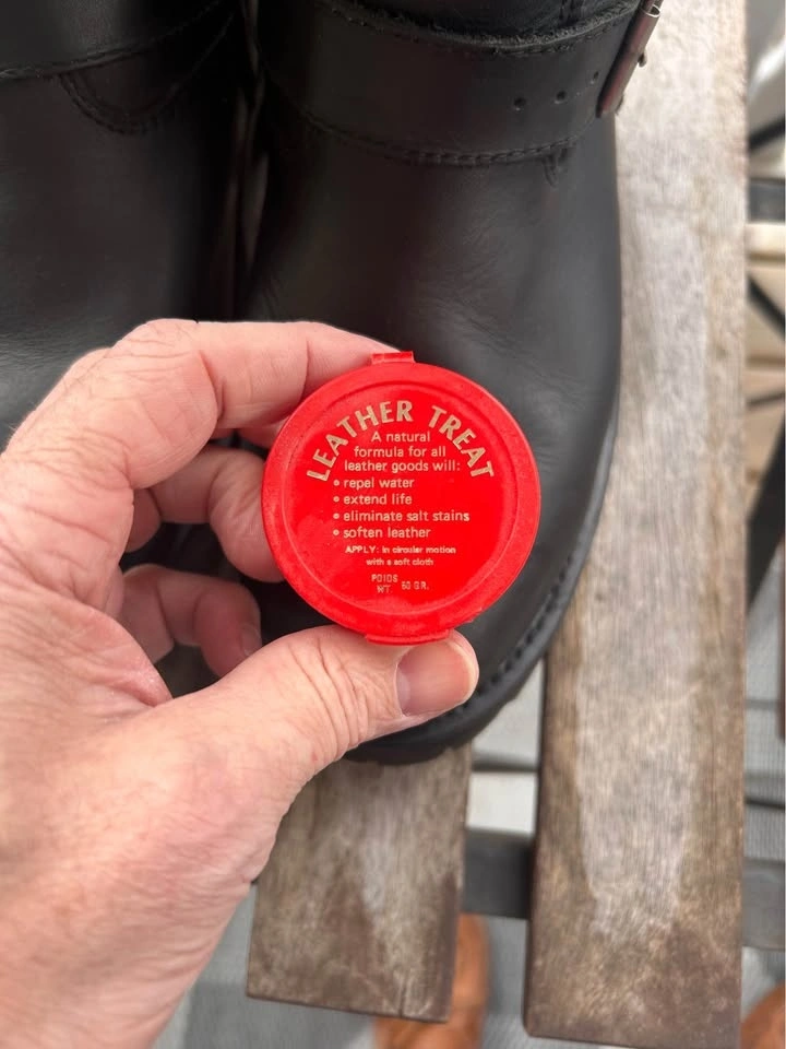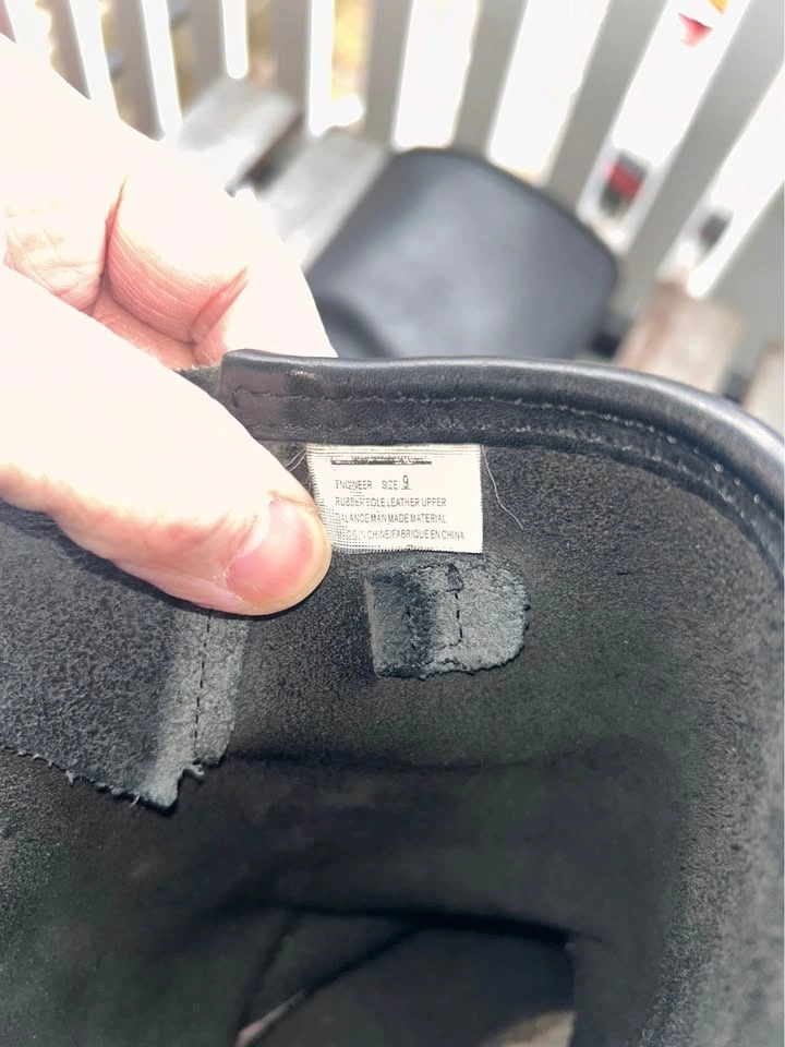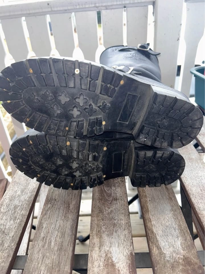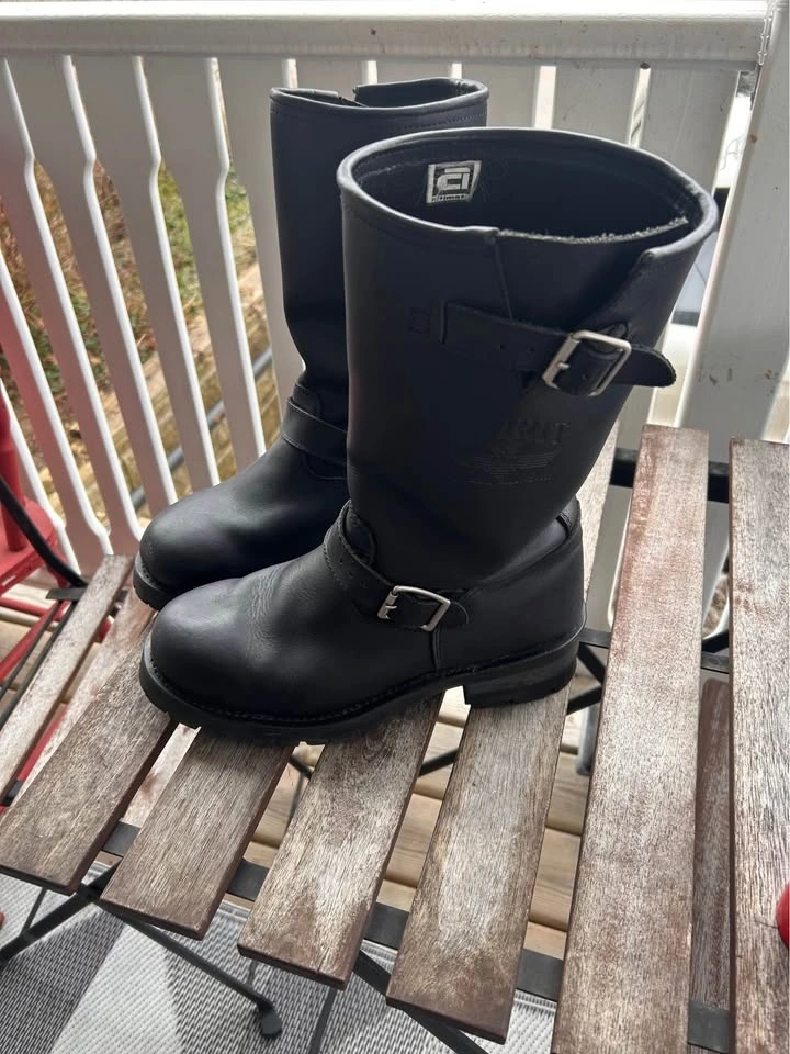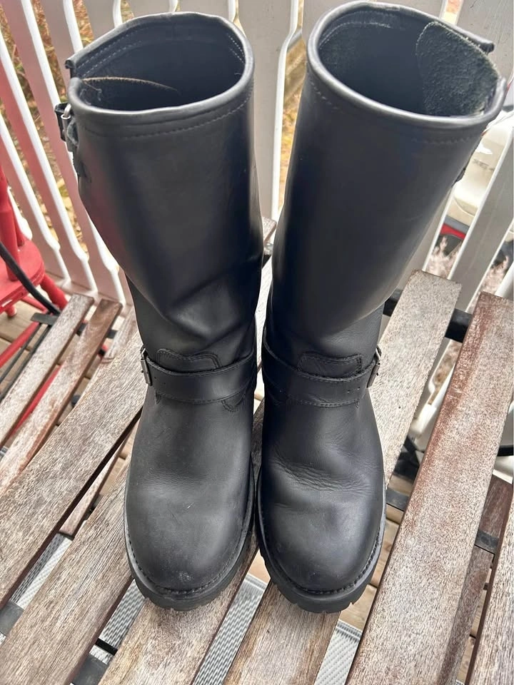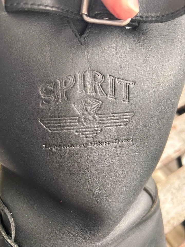 Spirit brand Engineer motorcycle boots. Only worn twice as they were a little too small for me (I wear a 9 1/2). They are virtually new, with a sole that gives lots of traction and can be replaced when worn as it's screwed on. Boot straps allow for some adjustment. I applied a coat of leather treatment for added protection.