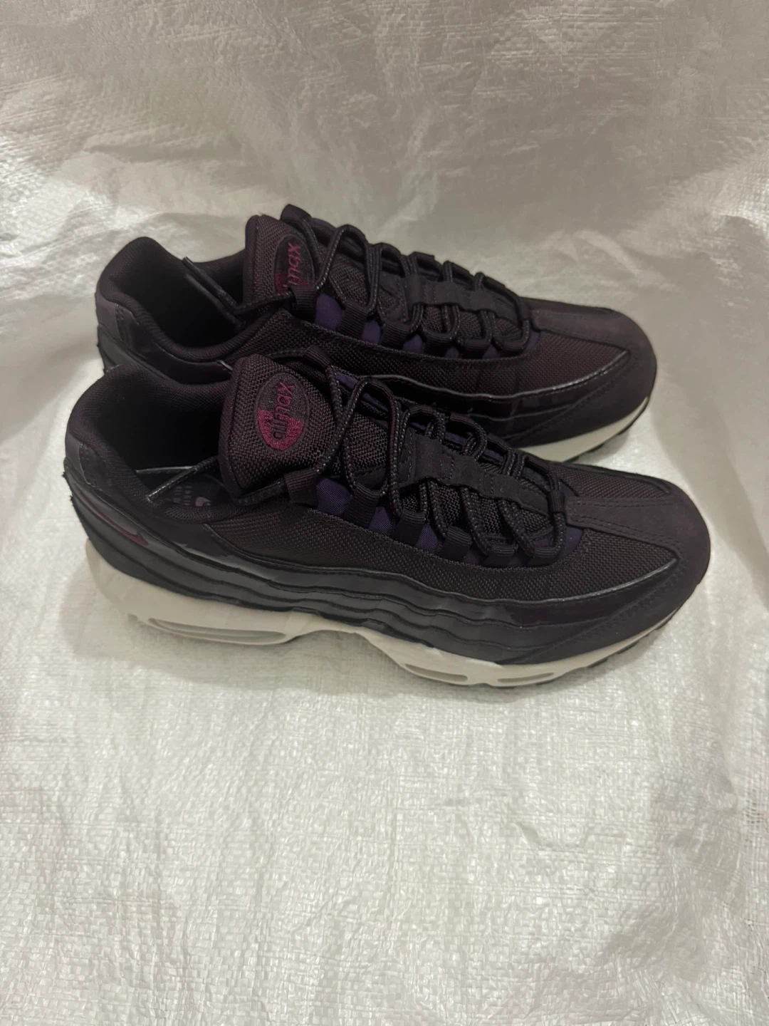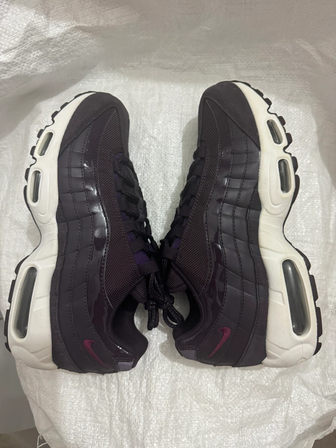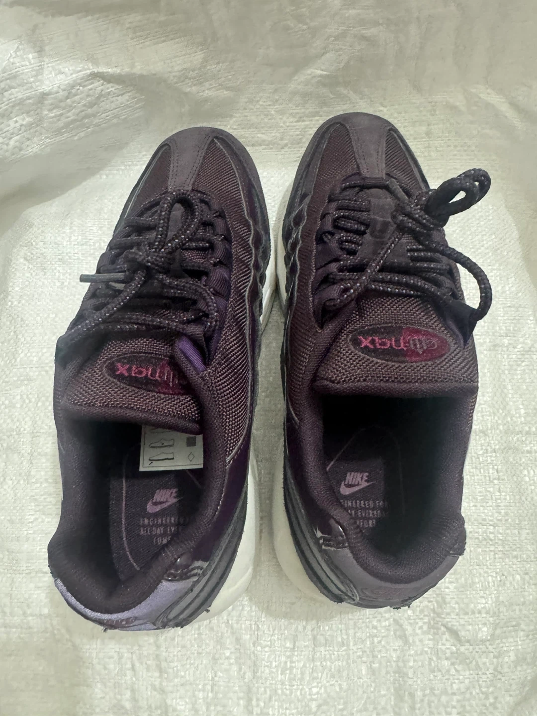 These Nike Air Max 95 sneakers are a deep purple colour with white soles. They feature the classic Air Max cushioning for comfort. Perfect for everyday wear!