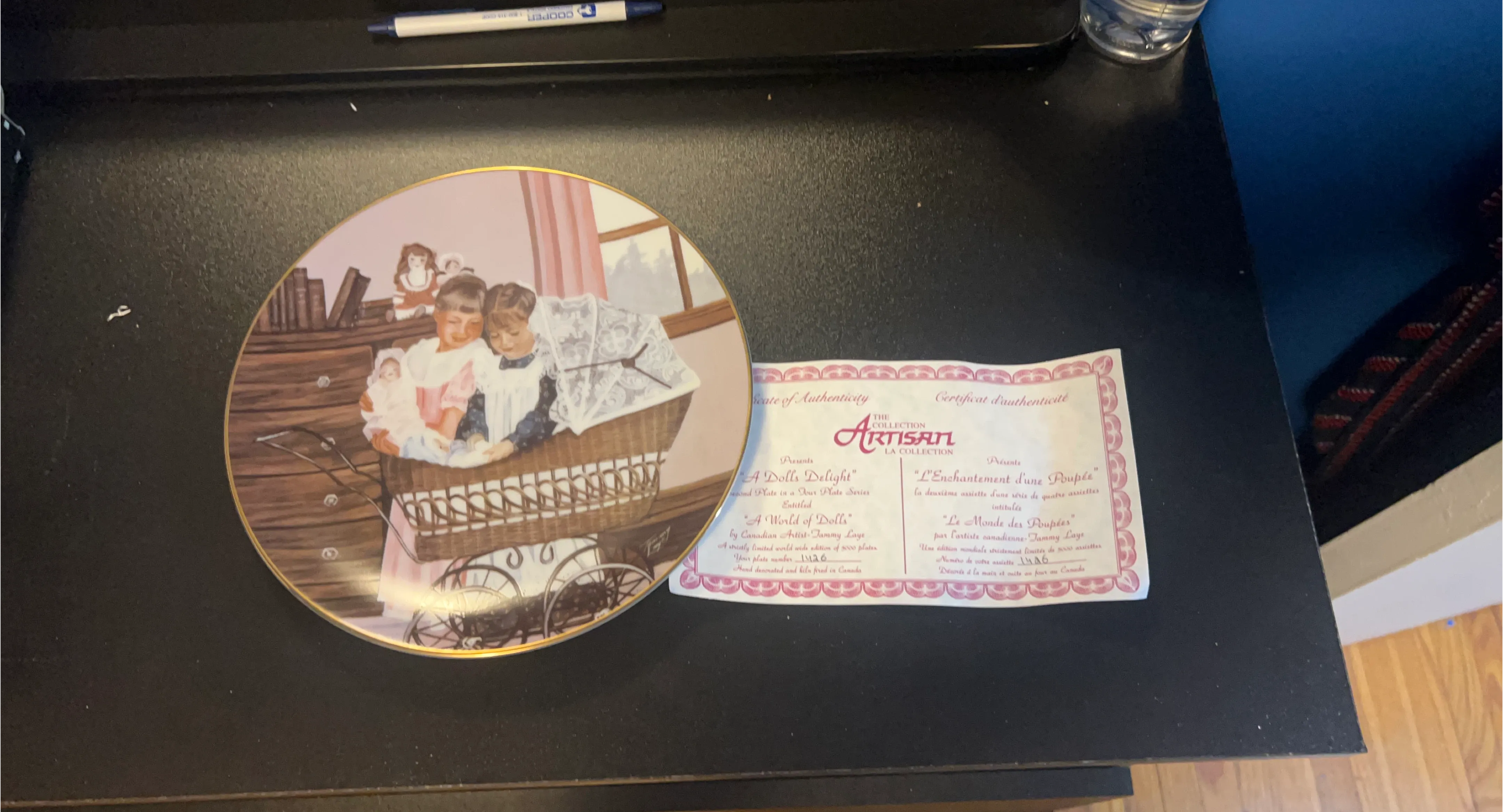 This is the "A Dolls Delight" decorative plate, the second in a "A World of Dolls" series. It's hand-decorated and fired in Canada. Limited worldwide edition of 5000 plates; this one is number 1426. It's a collectible piece.