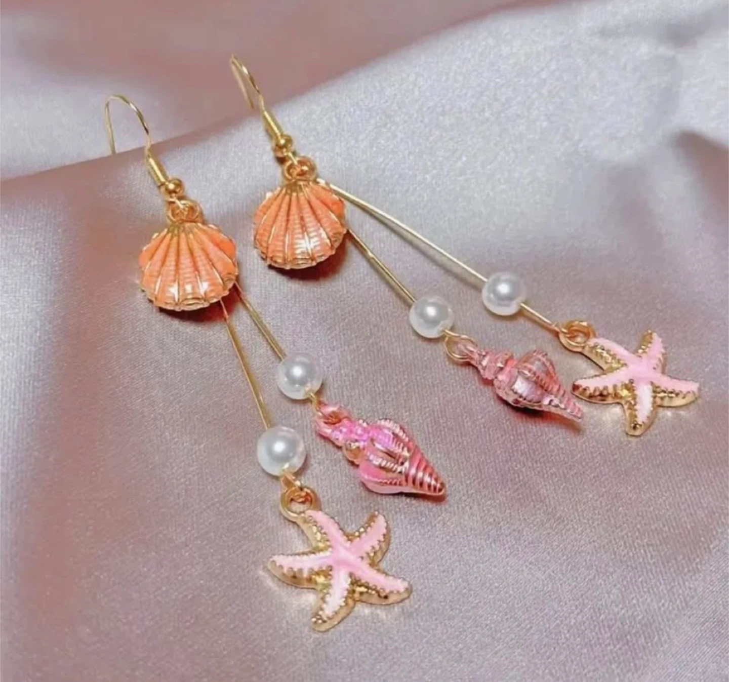 These are a pair of cute dangle earrings. They feature shell and starfish charms, with pearl accents. Perfect for adding a touch of summer to any outfit