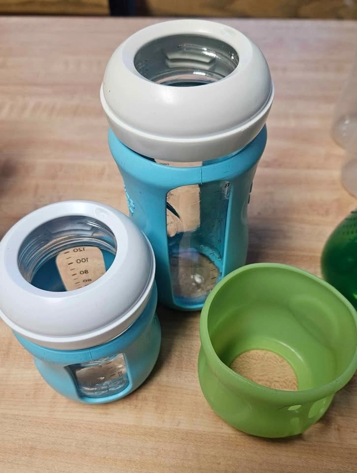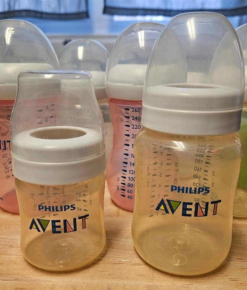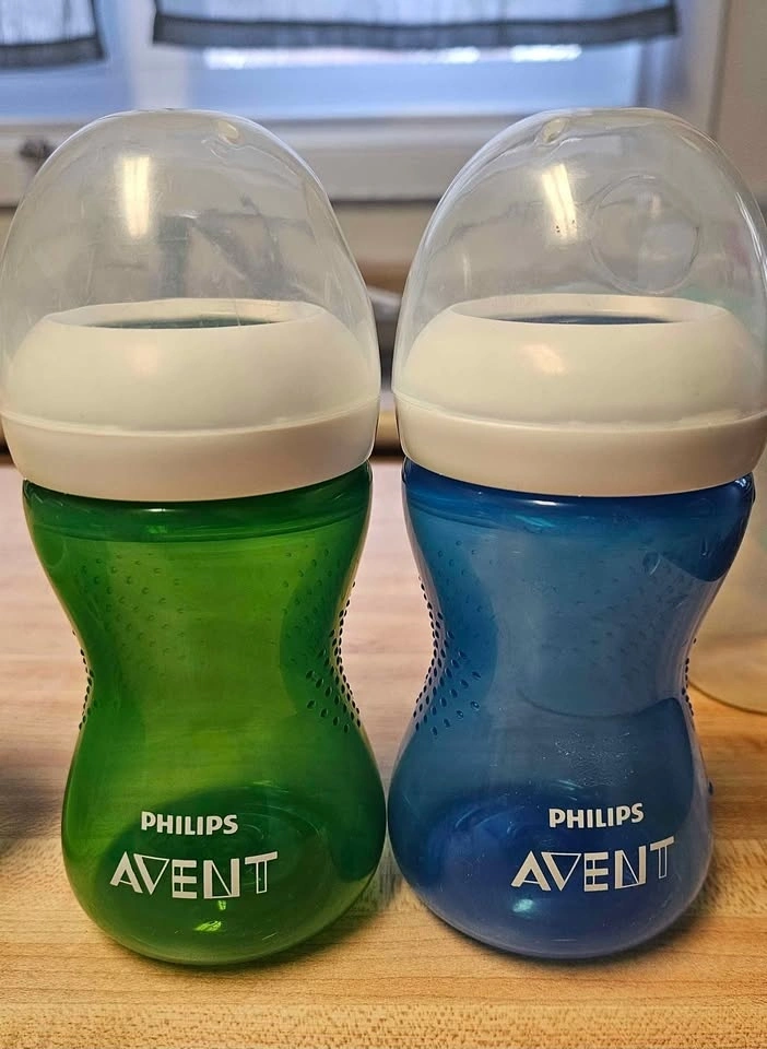 Pickup in Lancaster Park - the Military Base - Just North of Edmonton. Bottles and Lids, some have caps, no silicone pieces with them (can be bought in stores). Includes: 7 - 9oz plastic Avent Naturals bottles (two without measurement markings), 1 - 8oz Glass Avent Naturals bottle with silicone sleeve, 1 - 4oz Glass Avent Naturals bottle with 2 silicone sleeves, 1 - 4oz Plastic Avent anti-colic bottle, 1 - 9oz Plastic Avent anti-colic bottle, and 4 - 5oz Plastic evenflo storage bottles. Some discoloration from the dishwasher. No chips or cracks.