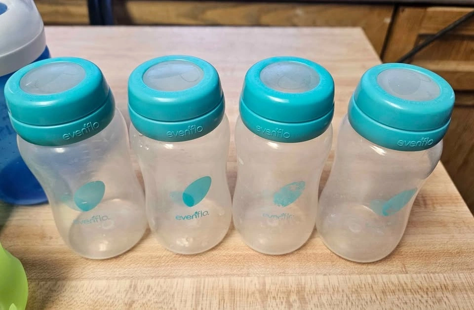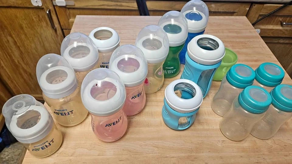 Pickup in Lancaster Park - the Military Base - Just North of Edmonton. Bottles and Lids, some have caps, no silicone pieces with them (can be bought in stores). Includes: 7 - 9oz plastic Avent Naturals bottles (two without measurement markings), 1 - 8oz Glass Avent Naturals bottle with silicone sleeve, 1 - 4oz Glass Avent Naturals bottle with 2 silicone sleeves, 1 - 4oz Plastic Avent anti-colic bottle, 1 - 9oz Plastic Avent anti-colic bottle, and 4 - 5oz Plastic evenflo storage bottles. Some discoloration from the dishwasher. No chips or cracks.