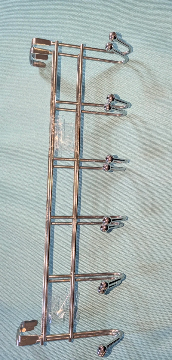 This chrome-plated metal over-the-door rack has six hooks. It's ideal for organizing coats, bags, or towels in any room. The simple design fits over most standard doors.