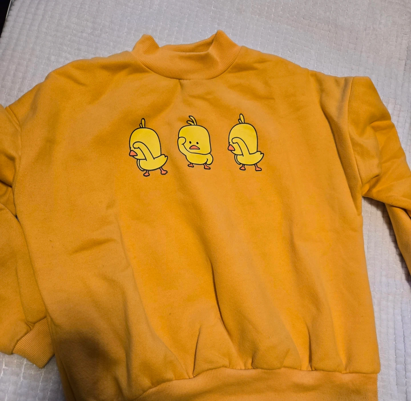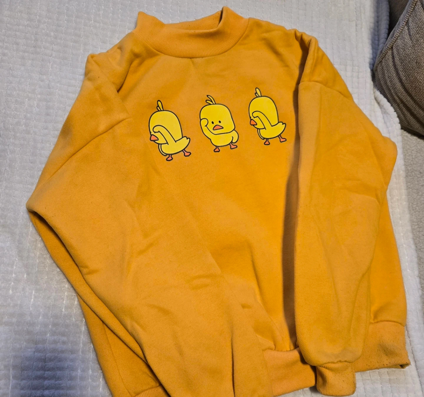 This yellow sweatshirt with cute duckies. It's a comfortable crewneck style with ribbed cuffs and hem. (Soft fabric, only worn once!)
